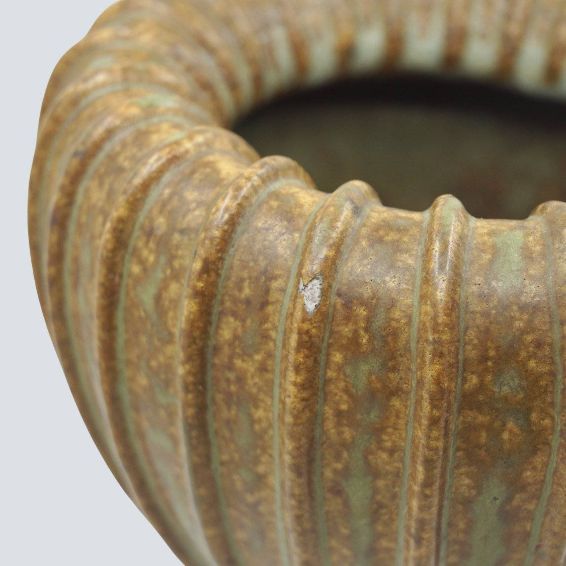 Arne Bang; Riflet vase af stentøj, nr. 139 Dekoreret med grønblå og brun glasur.Arne Bang. Dessin nr. 139.