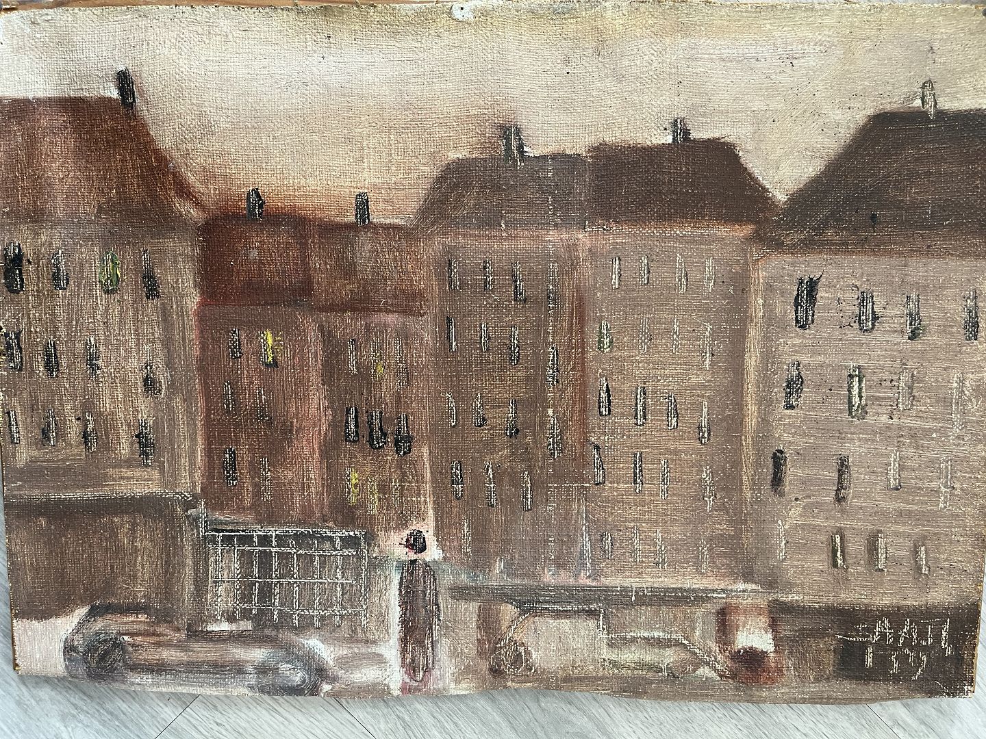 Maleri af Svend Aage Tauscher - Byparti med bil og personer 1959.