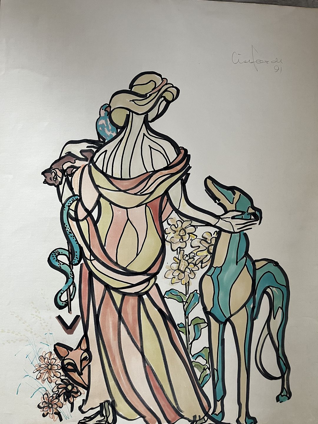 Akvarel af Lise Færch - Kvinde med forskellige dyr 1991