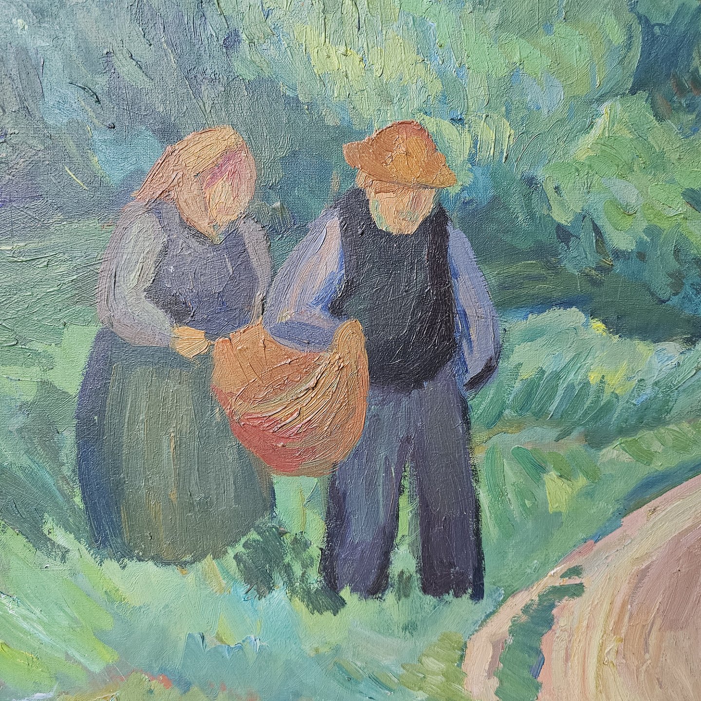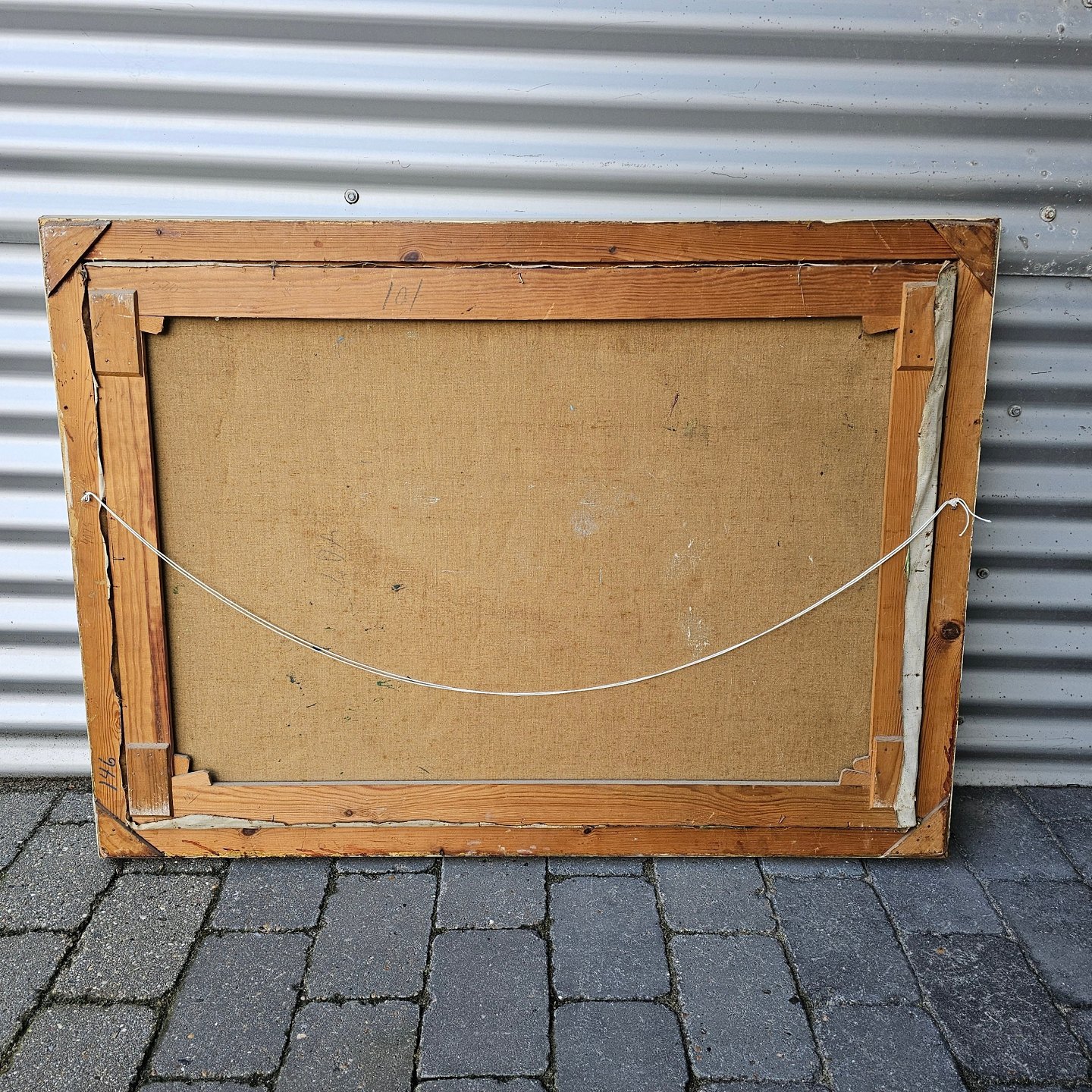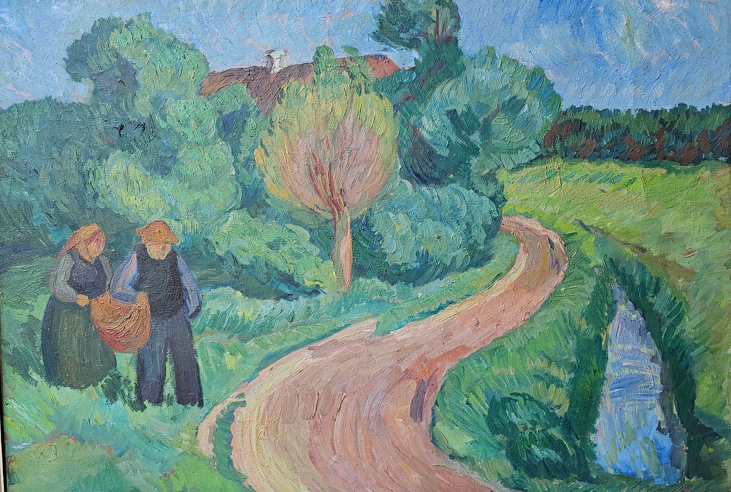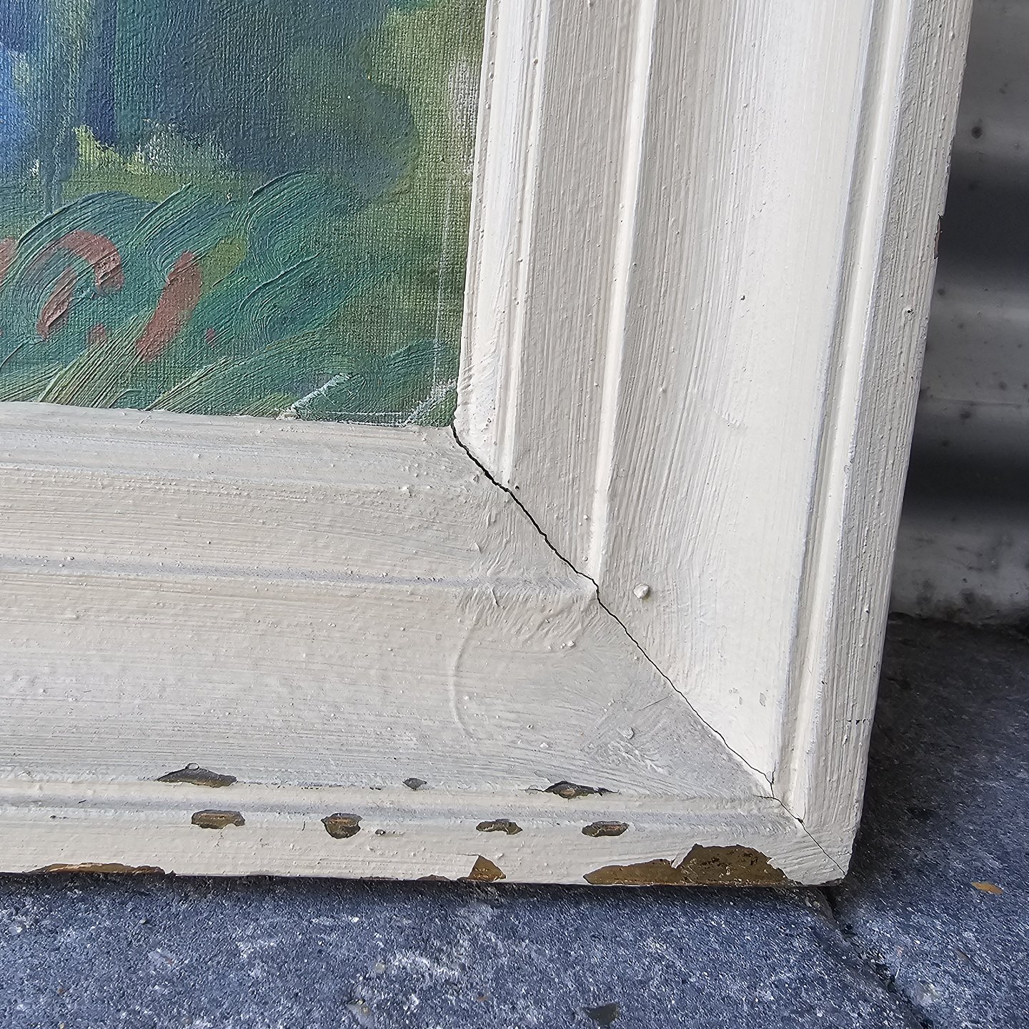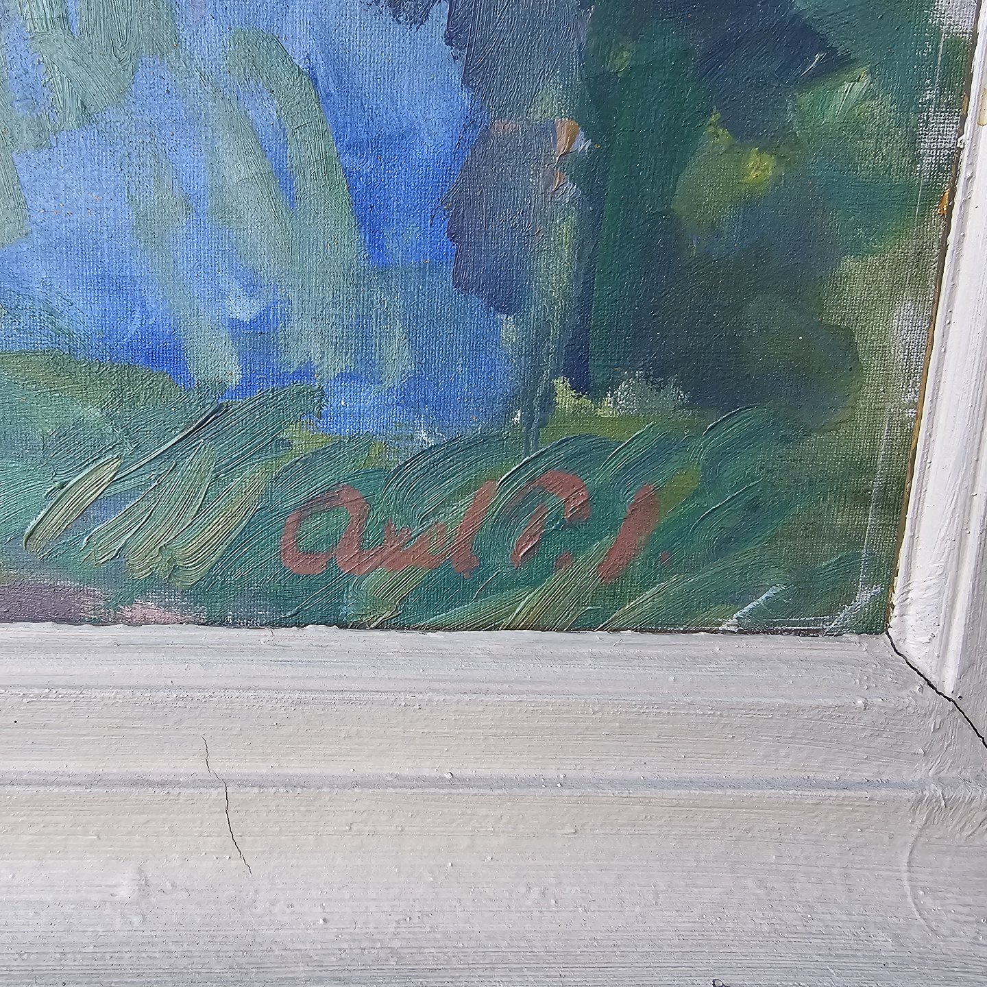 Oliemaleri på lærred monteret i hvidmalet ramme med motiv af en landevejKunstner Axel P Jensen (1885-1972)