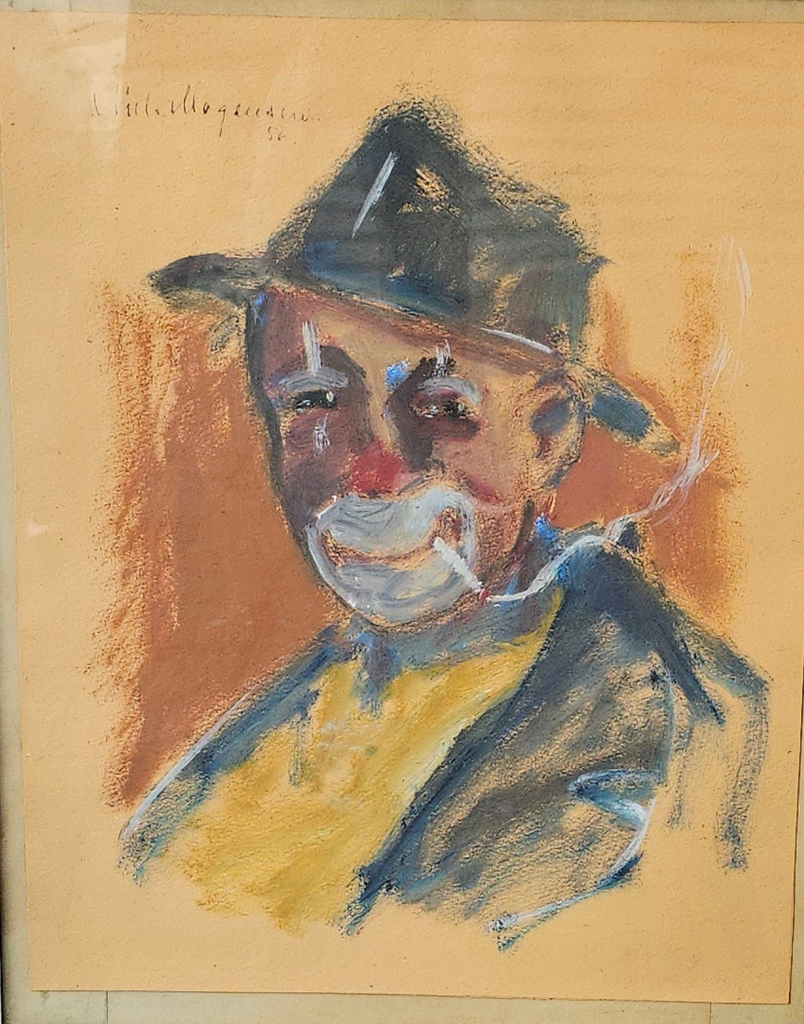 Oliekridt på papir monteret i hvidmalet ramme med motiv af en klovnKunstner Axel P Jensen (1885-1972)