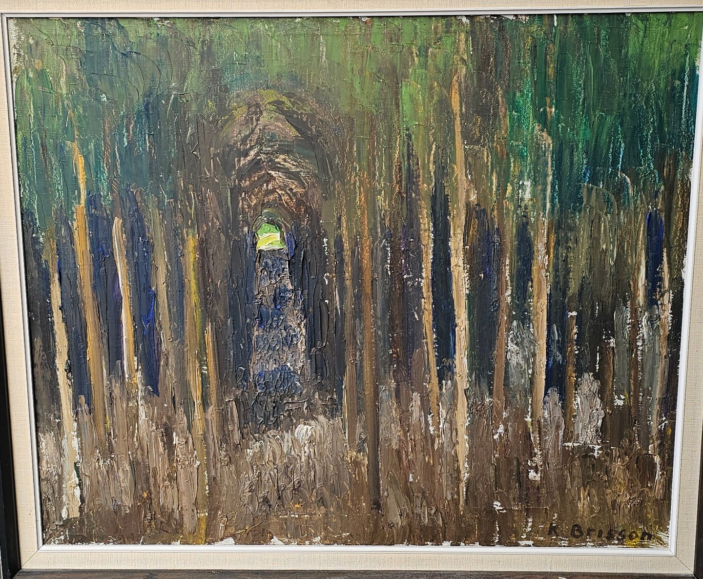 Oliemaleri på lærred med titlen Granskov. Monteret i sortmalet ramme med motiv af en sti gennem grantræer, dateret 1960