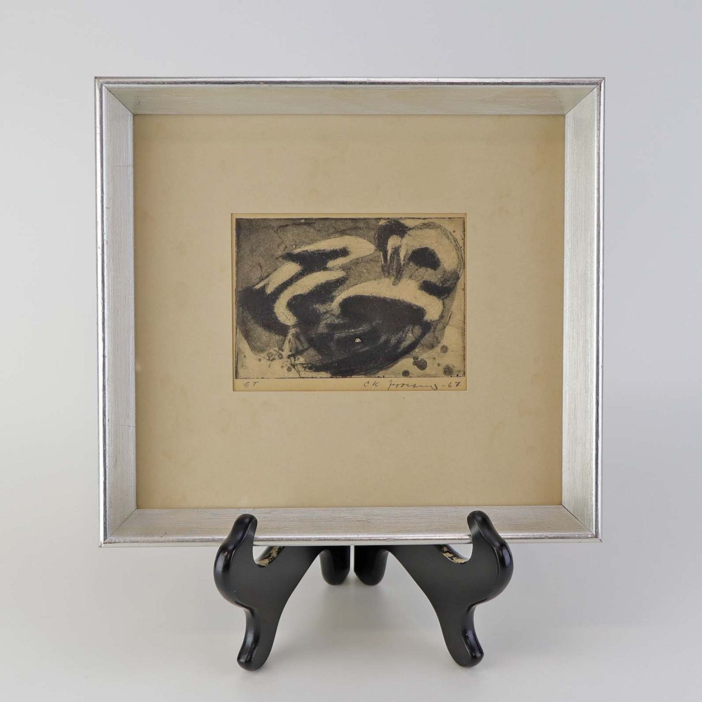 Litografi fra 1967 i passepartout ramme med sort hvidt naturmotiv af to fugleKunstner C K Jeppesen