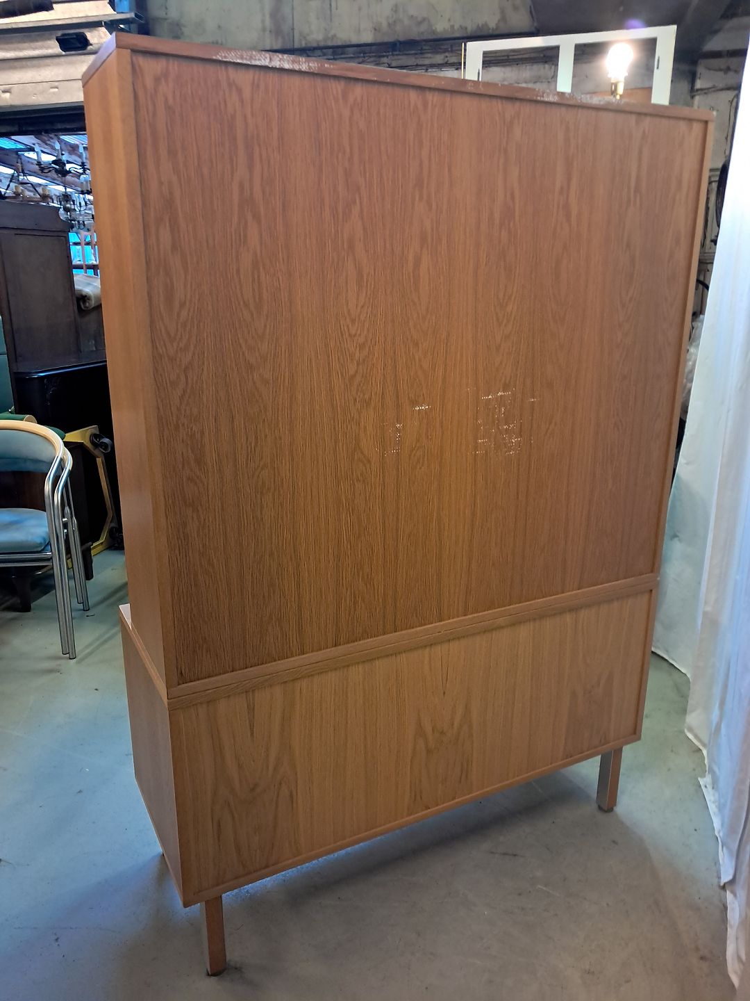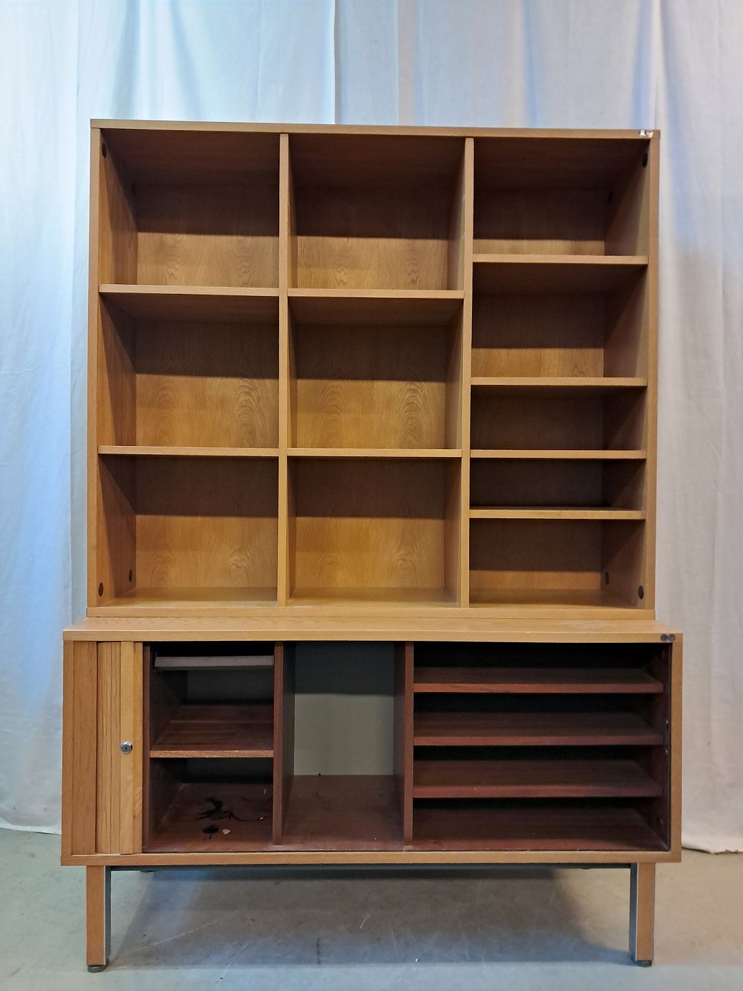 2 delt reolsektinon i fineret egetræ med jalousilåge, fra 1980erne.Den har brugsspor og der medfølger ikke nøgle.