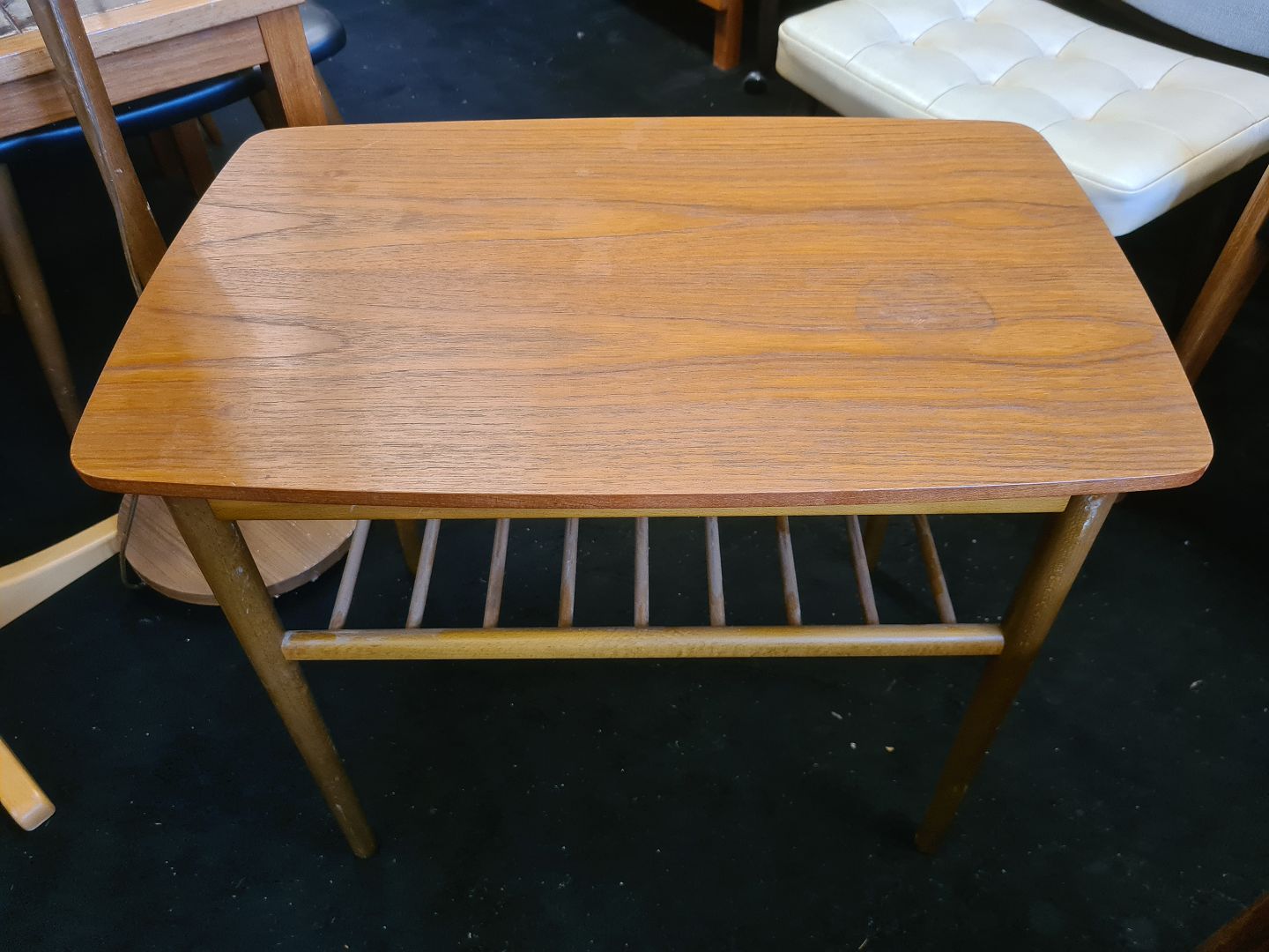 Dansk Design lampebord fra 1960'erne i teak og bøg. Fremstår pænt og stabilt dog med lidt brugsspor på pladen.(Billede)Højde 50 cm. Længde 60 cm. Bredde 38 cm.