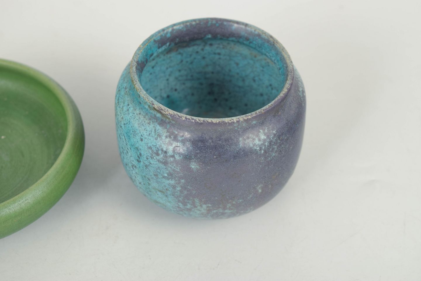 Svend Hammershøi for Kähler, lille vase og fad.Lille vase og matchende fad i stentøj med enkle former og karakteristiske glasurer i grønne og blå nuancer. Et fint eksempel på Hammershøis stilrene formsprog og eksperimenterende glasurarbejde fra 1930’erne. Stemplet i bunden.