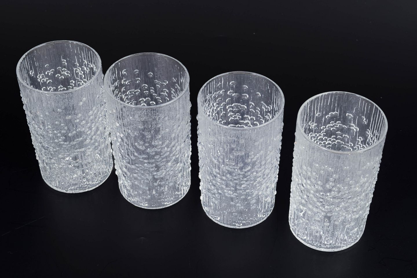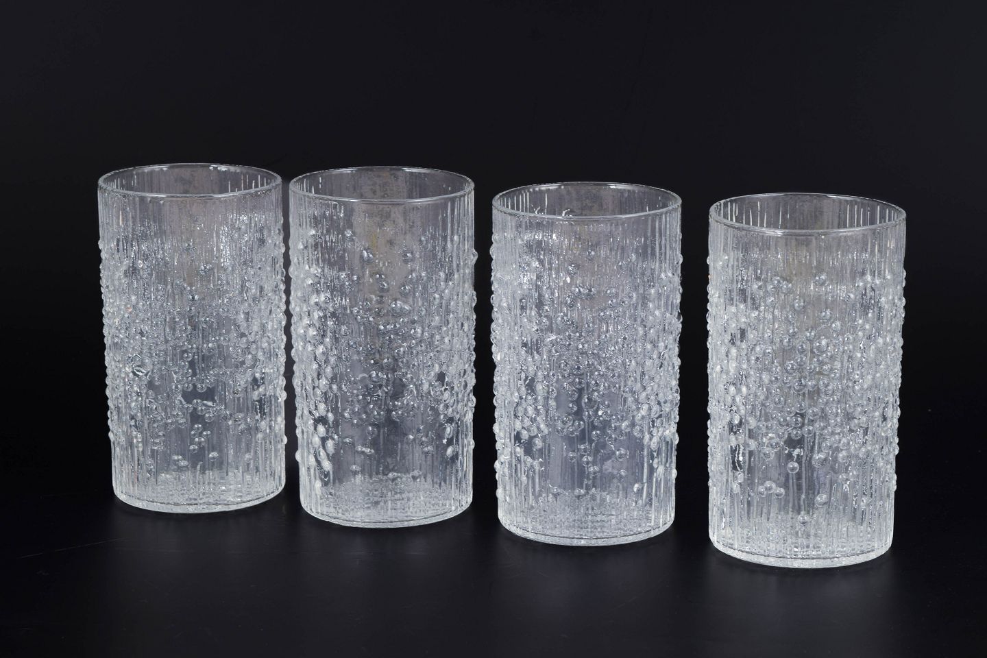 Tapio Wirkkala for Iittala, sæt af fire drikkeglas "Hopla" serien.Sæt af fire drikkeglas i presset glas med karakteristisk organisk struktur og reliefmønster, der skaber et levende lysspil i overfladen. Designet er et klassisk eksempel på finsk glasdesign fra perioden. Model Hopla i klart glas.