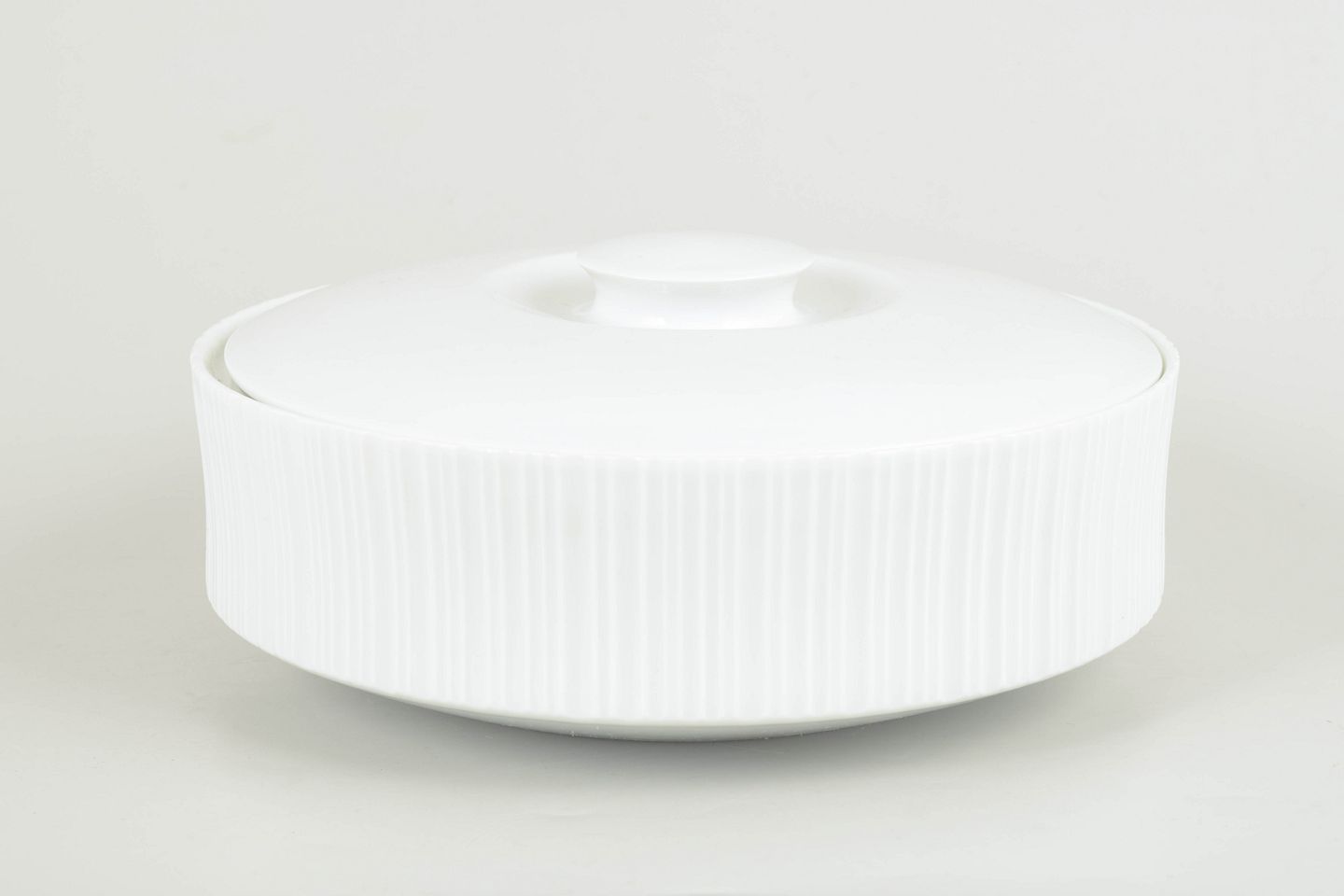 Tapio Wirkkala for Rosenthal, skål med låg.Rund skål med låg i porcelæn med lodrette rifler og et stramt, funktionalistisk formsprog, typisk for Tapio Wirkkalas arbejde for Rosenthal i 1980’erne.