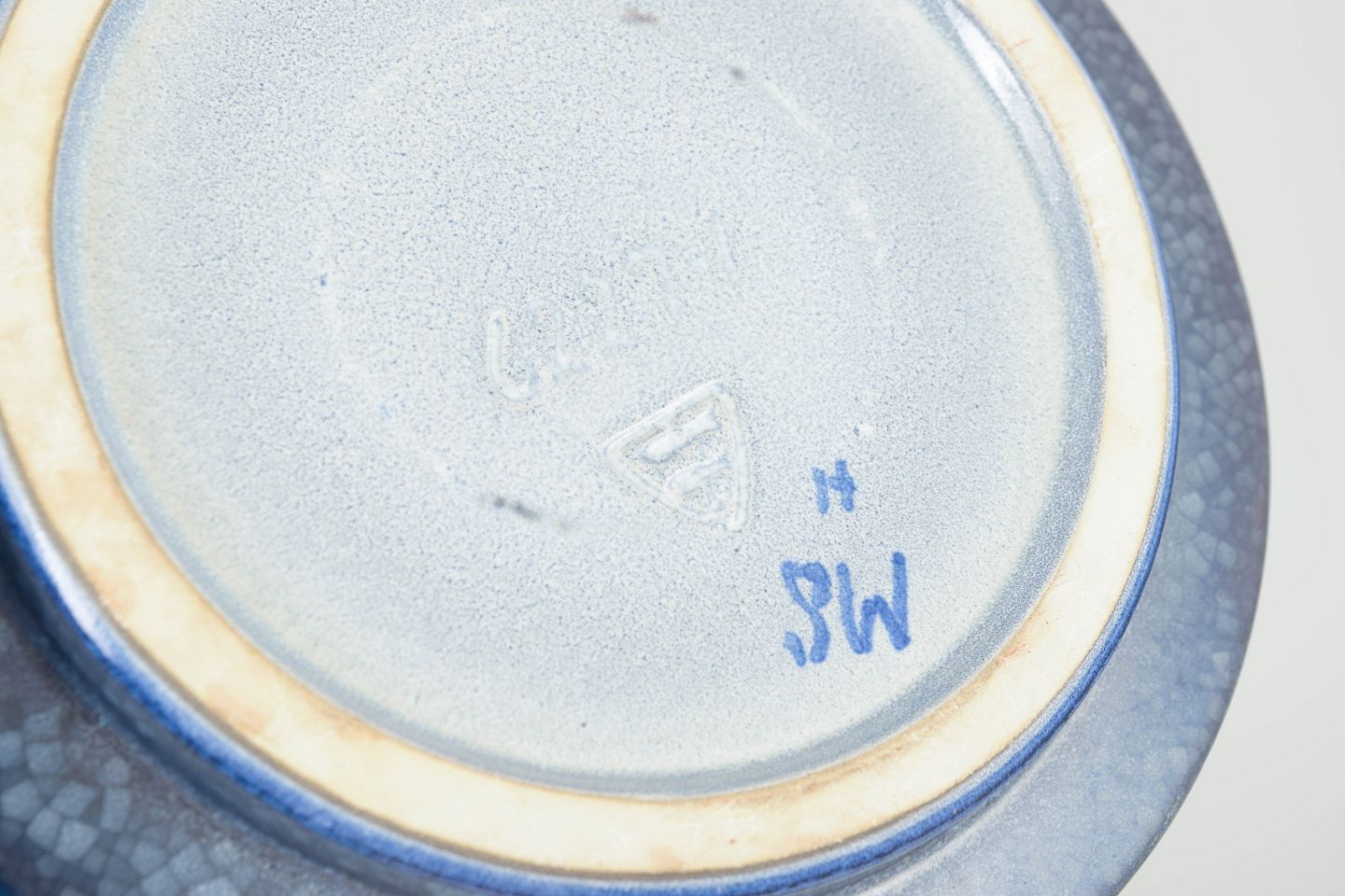 Marianne Starck for Michael Andersen, Bornholm, fad.Dekorativt keramikfad i stentøj med cirkulært reliefmønster i blå glasur. Motivet består af gentagne ringformer med fin tekstur, typisk for Marianne Starcks arbejde for Michael Andersen & Søn. Stemplet i bunden.