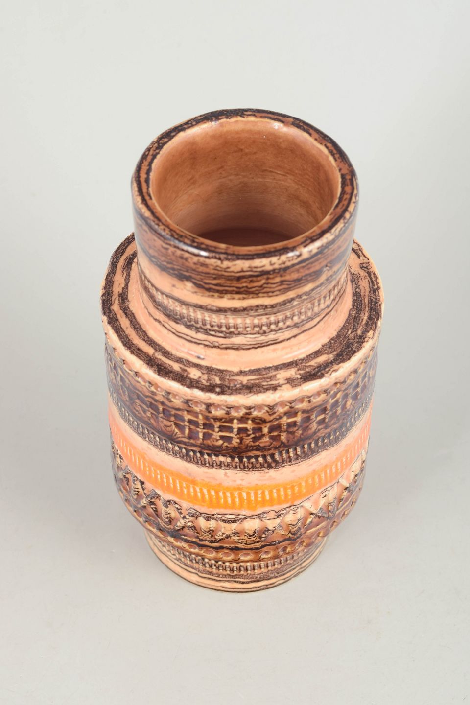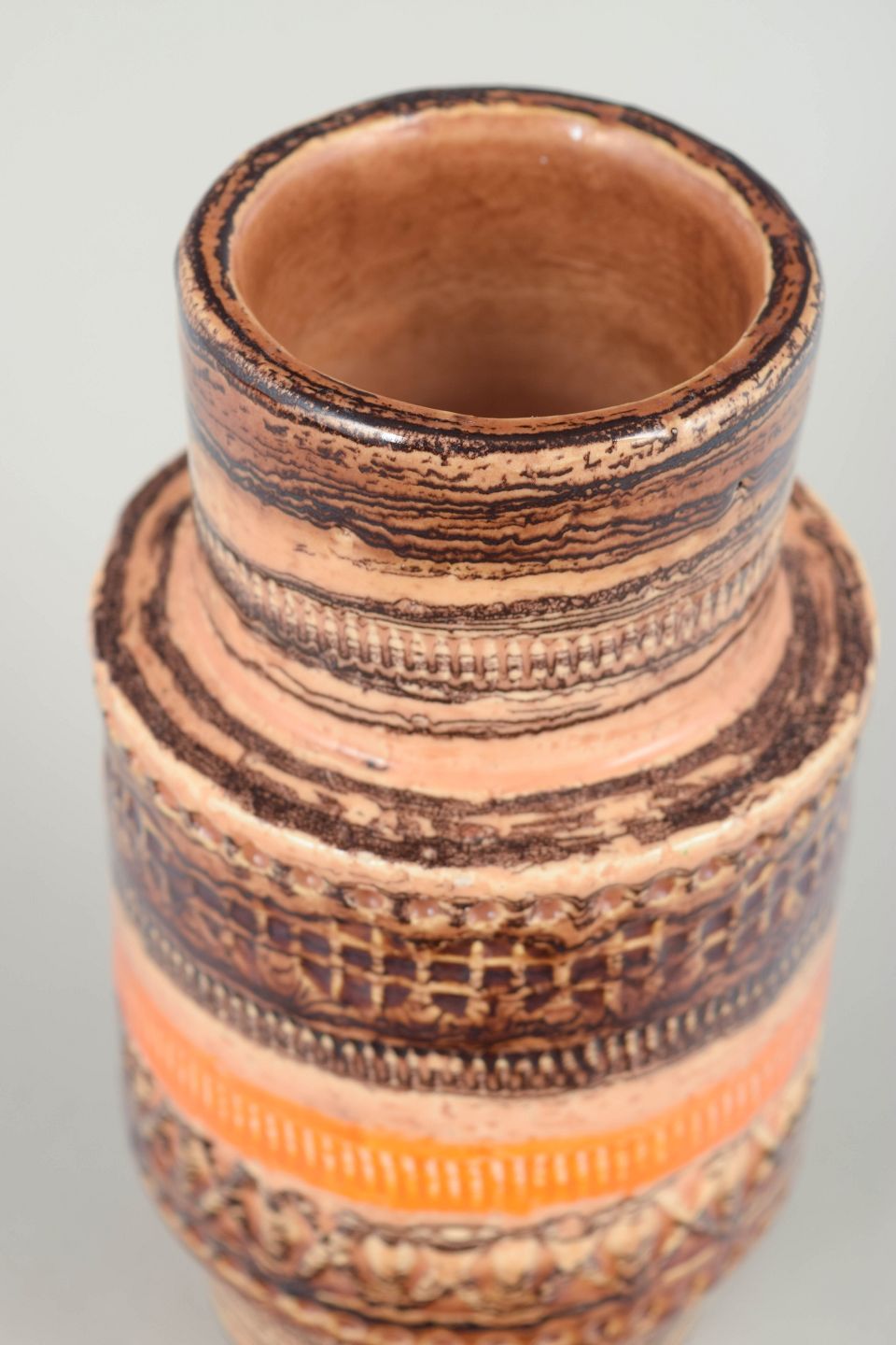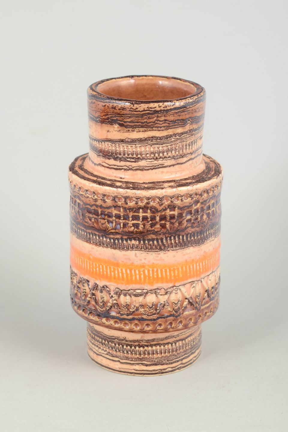 Aldo Londi for Bitossi, vase.Dekorativ stentøjsvase med karakteristisk relief og horisontale bånd i jordfarver og orange nuancer, udført i klassisk italiensk stil fra 1970’erne.