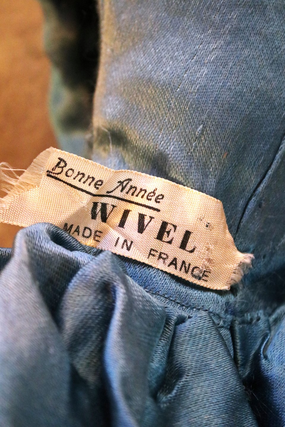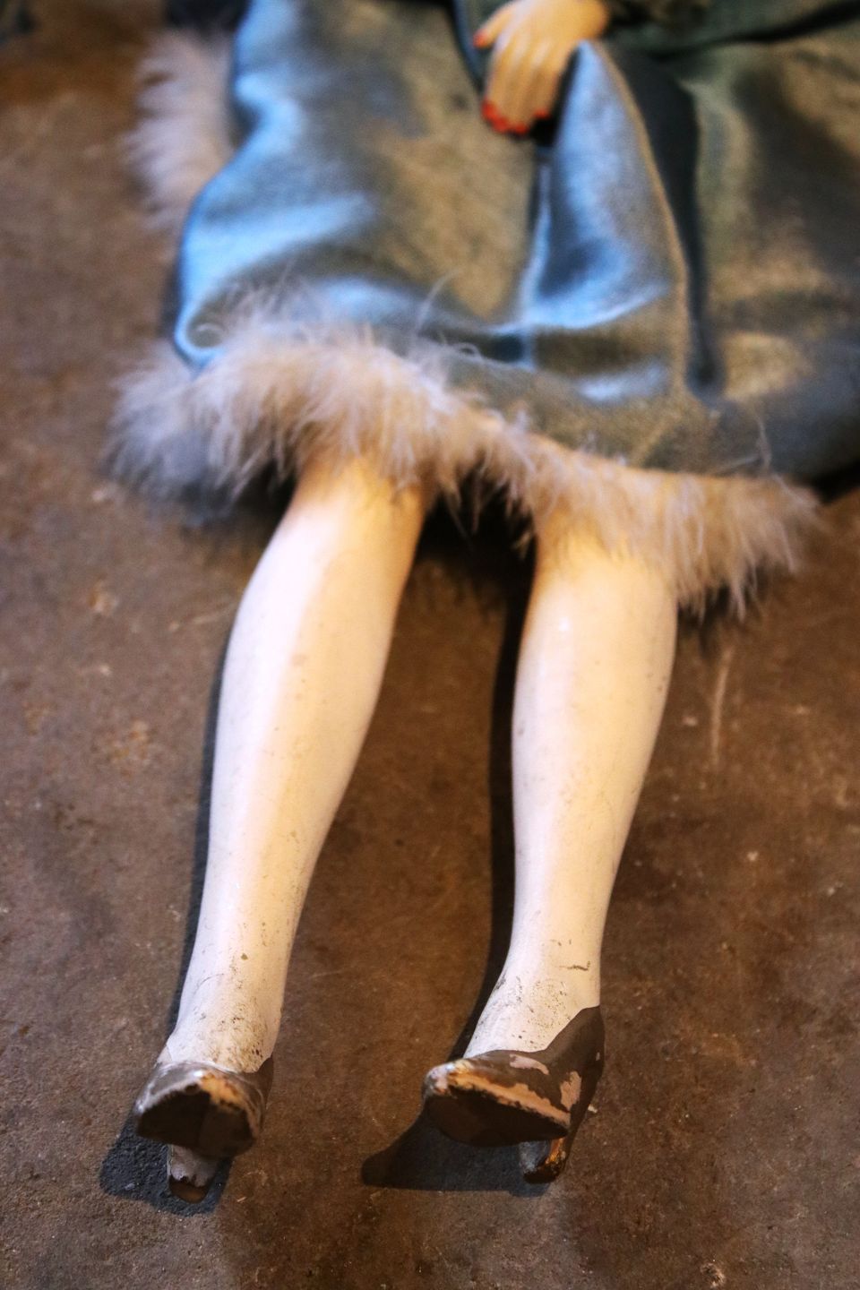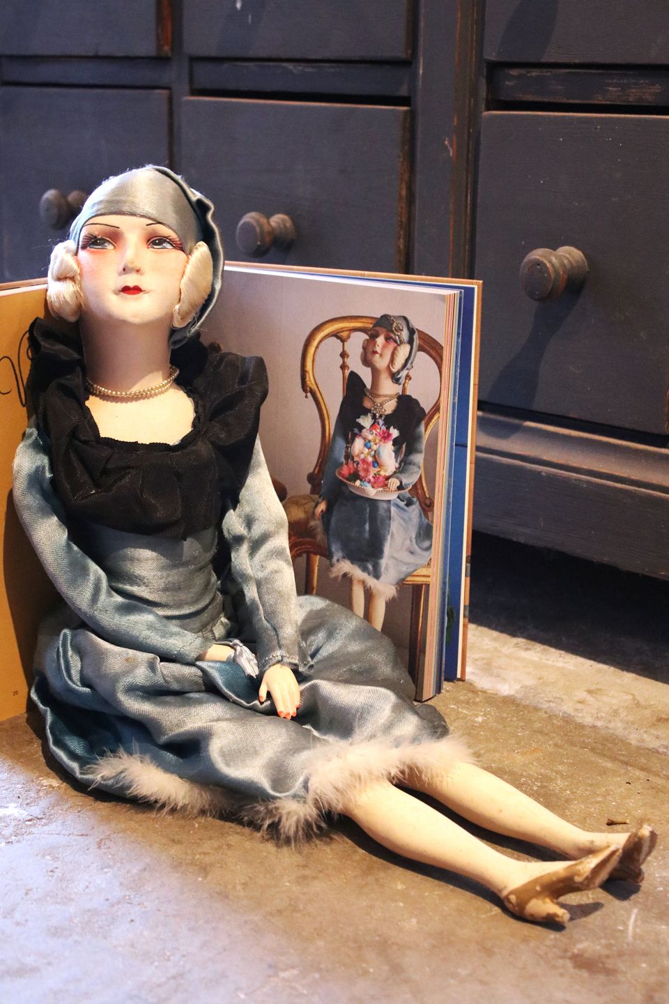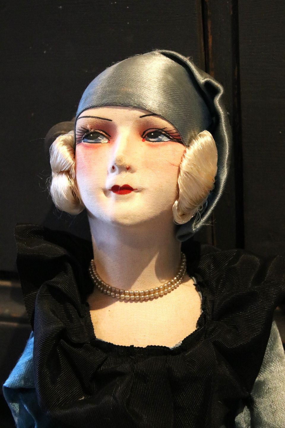 Gammel fransk vintage boudoir dukke i stof med silkekjole.