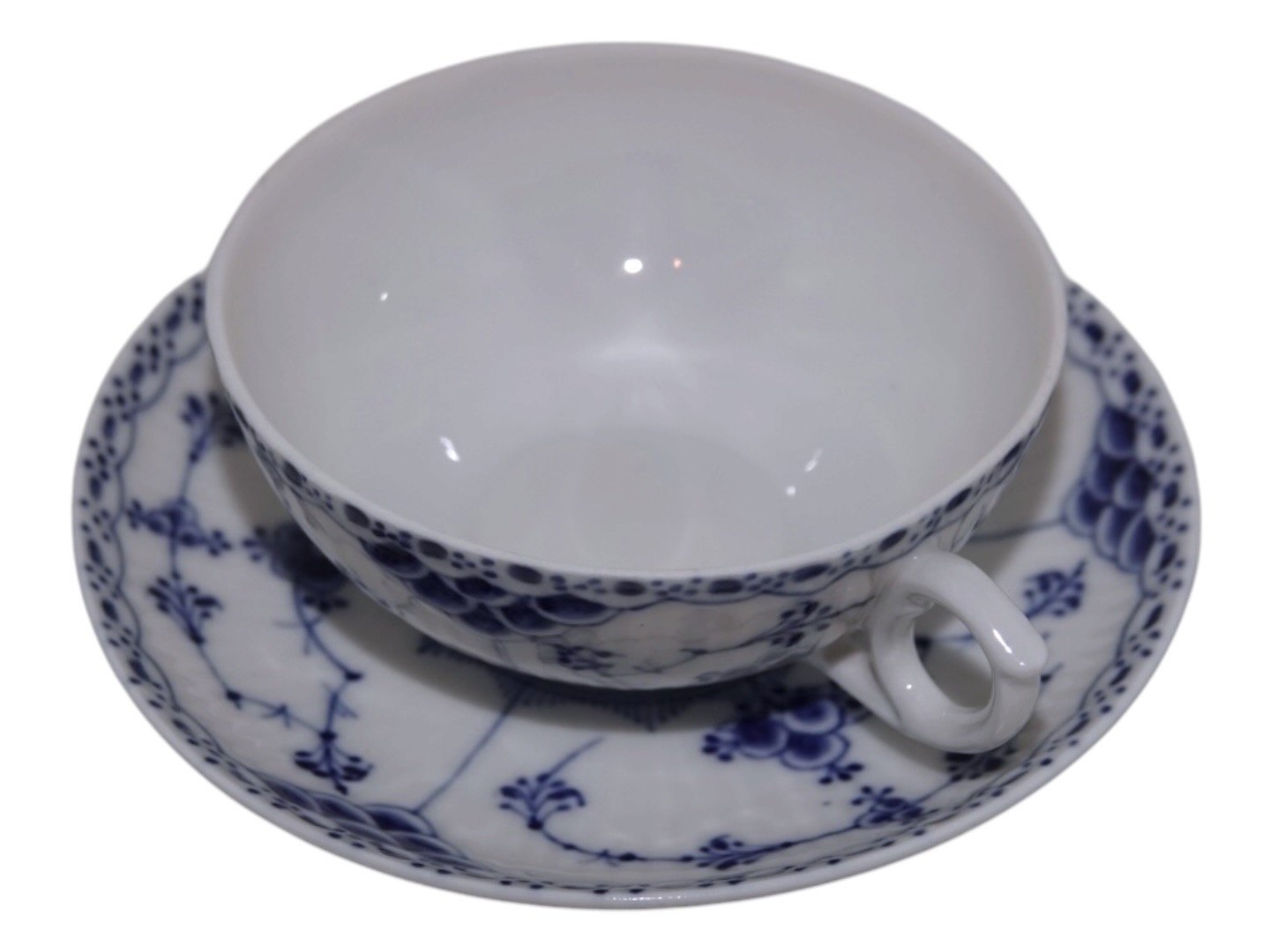 Royal Copenhagen Musselmalet Halvblonde, lille chokoladekop med tilhørende underkop.Dekorationsnummer 1/526.
