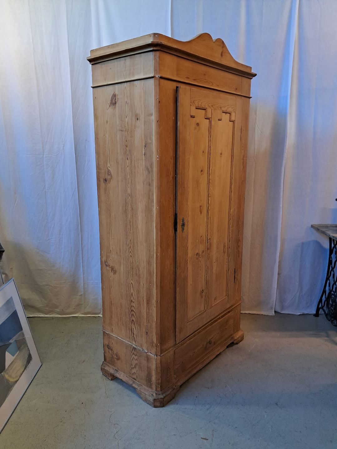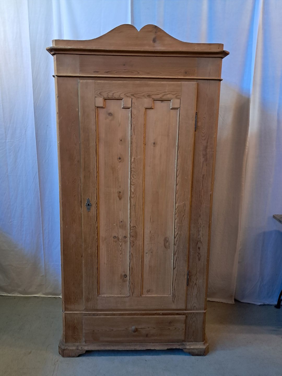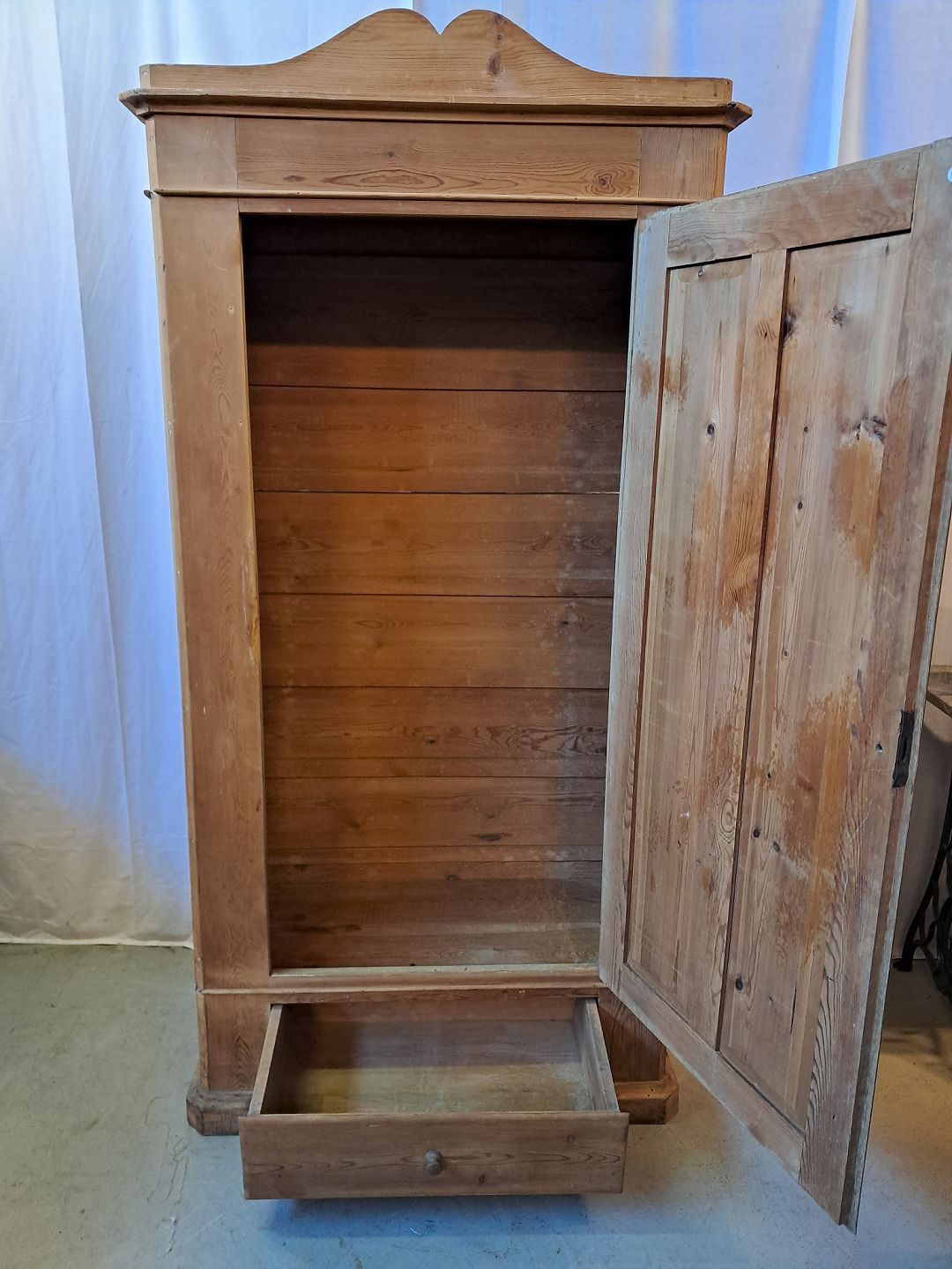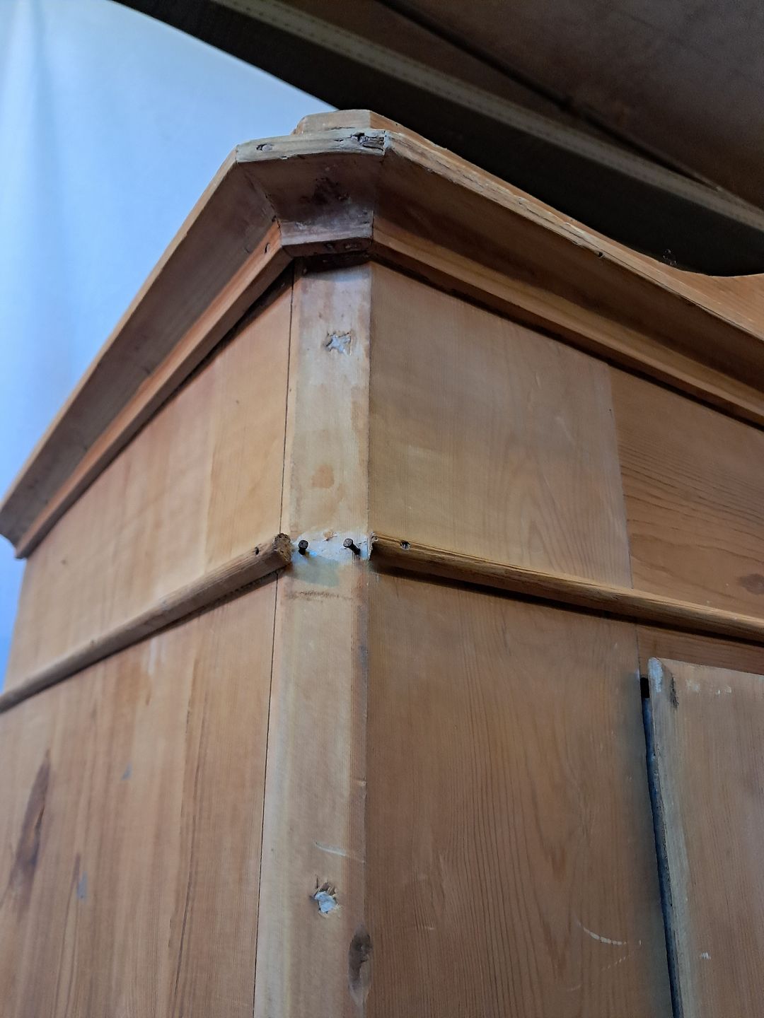 Skab i massivt fyrretræ, fra 1910erne.Det har brugsspor og defekte lister.