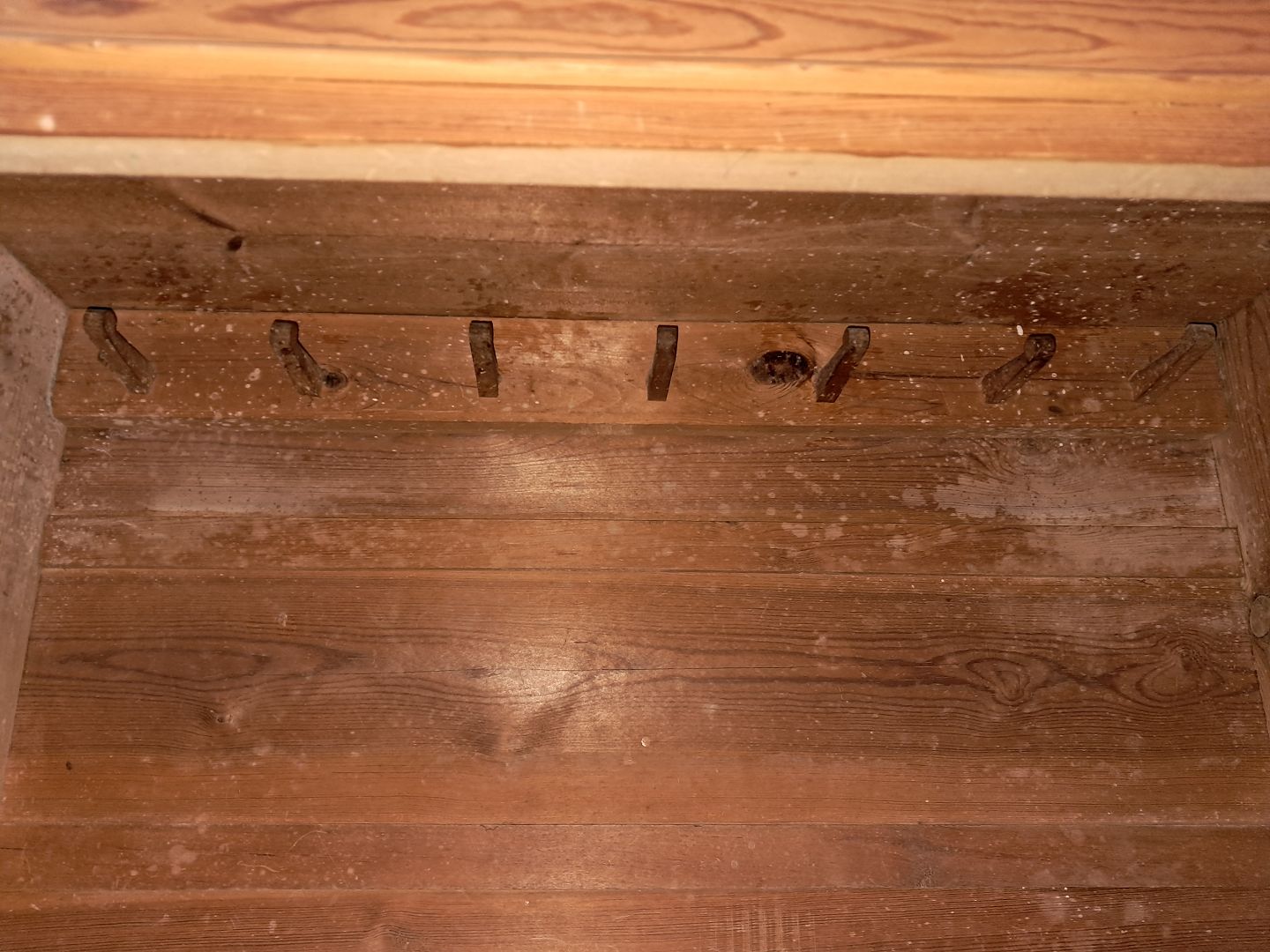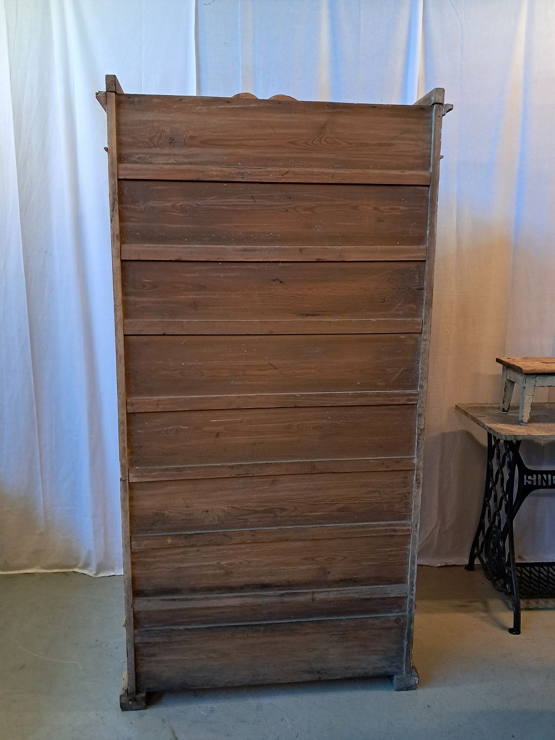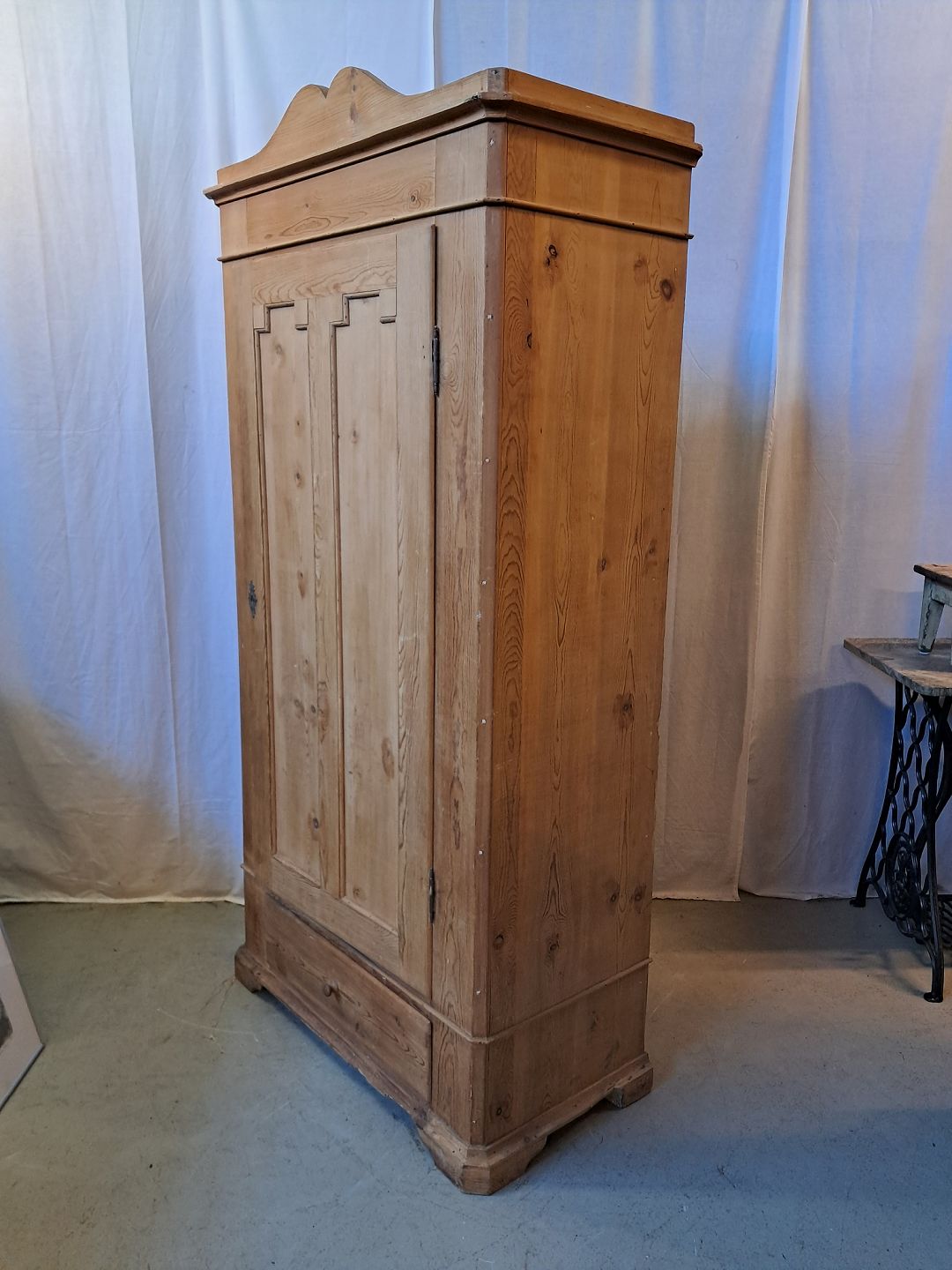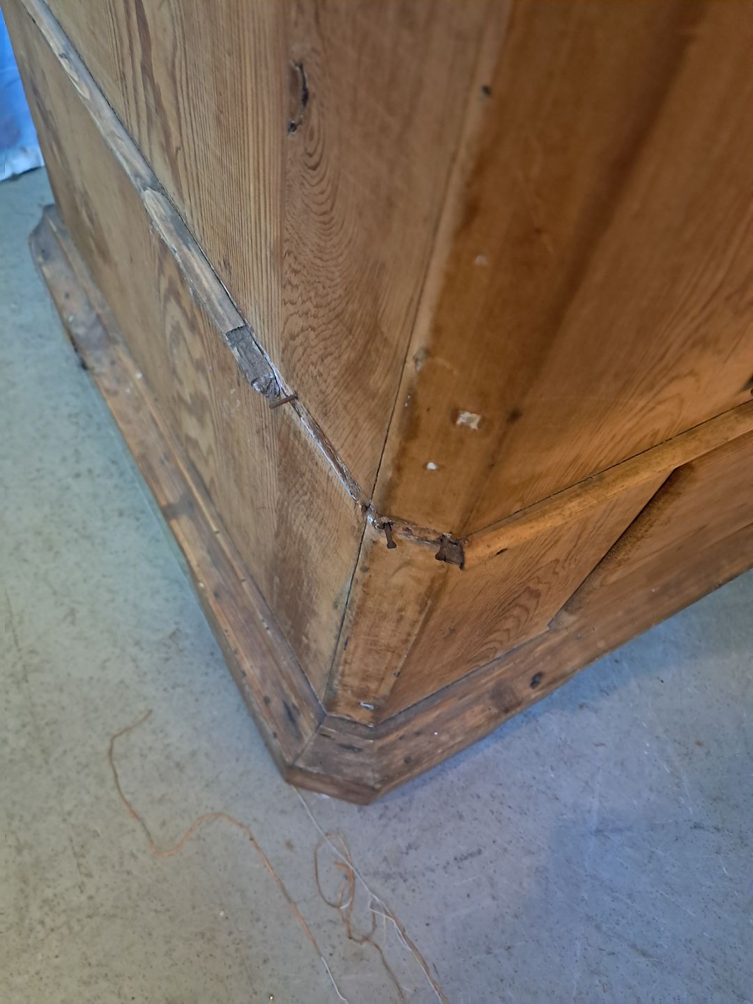 Skab i massivt fyrretræ, fra 1910erne.Det har brugsspor og defekte lister.