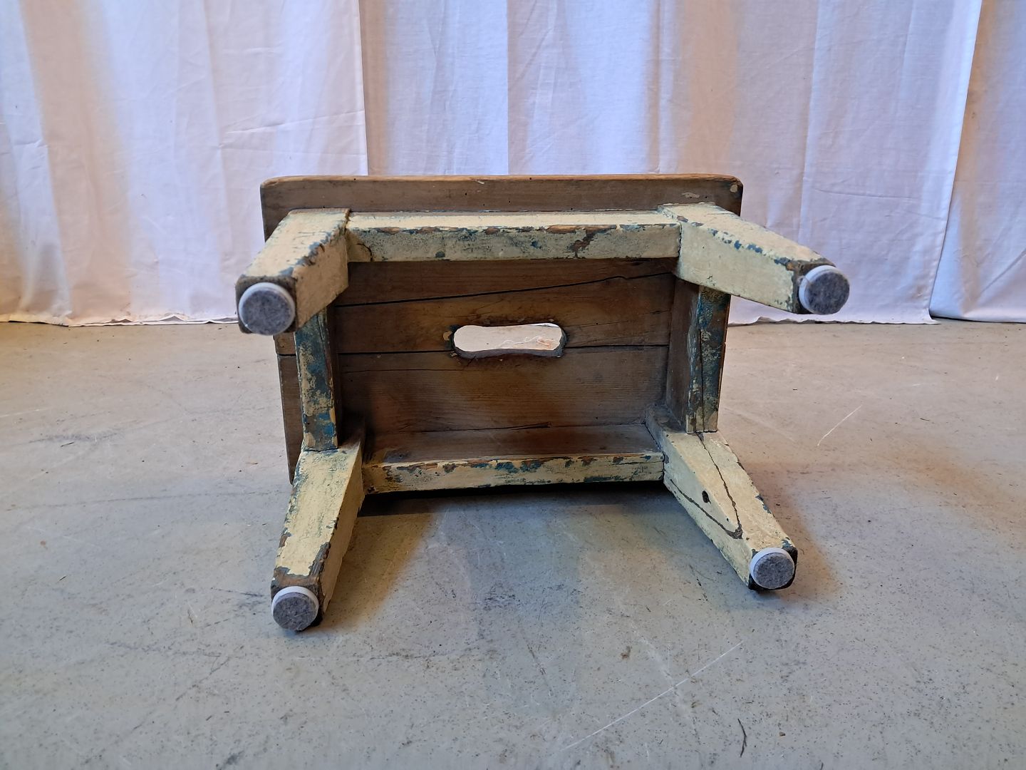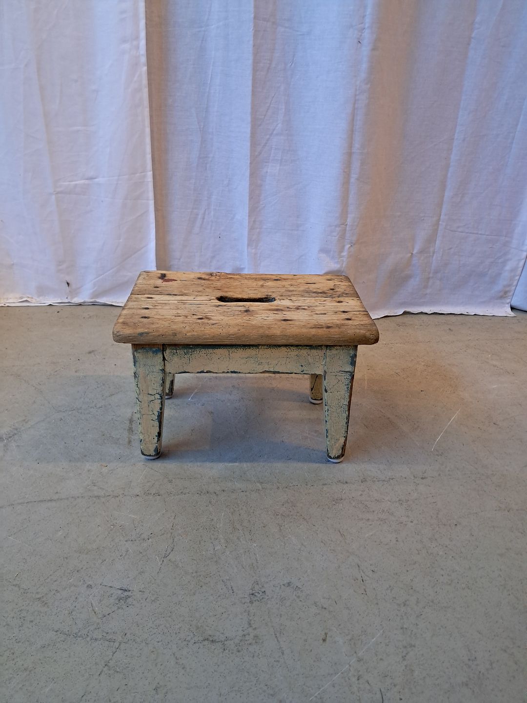Lille taburet i massivt fyrretræ, fra 1910erne.Den har brugsspor.