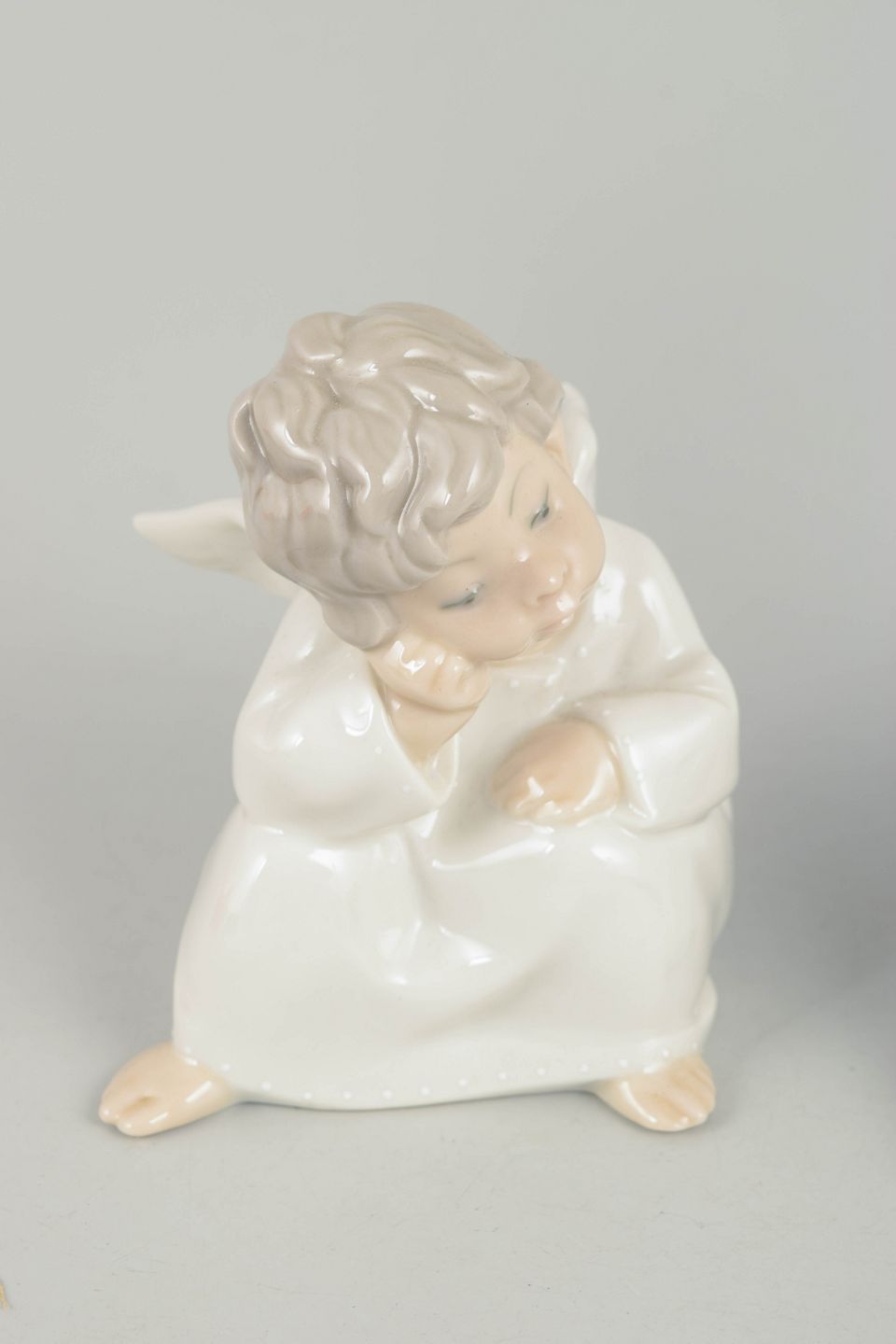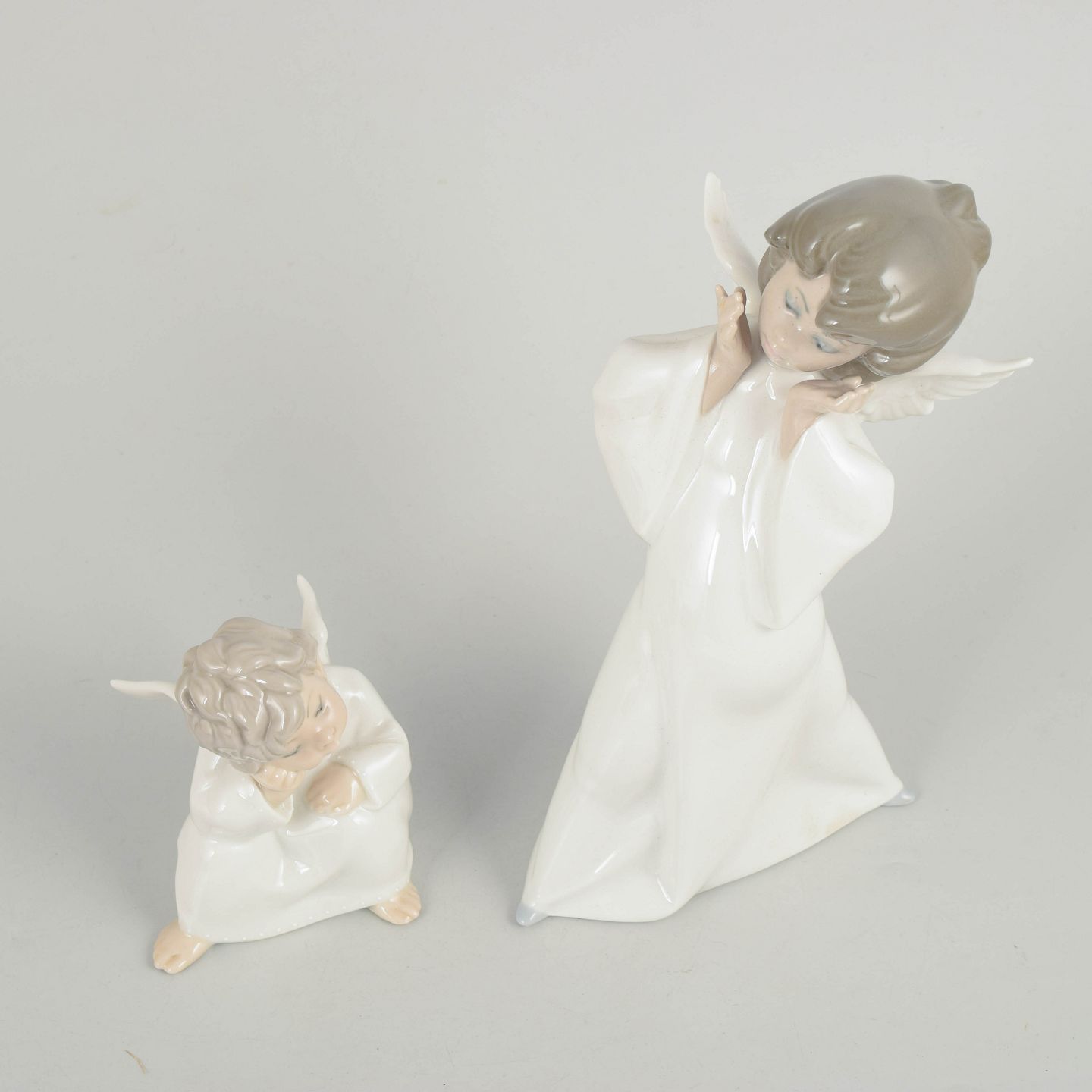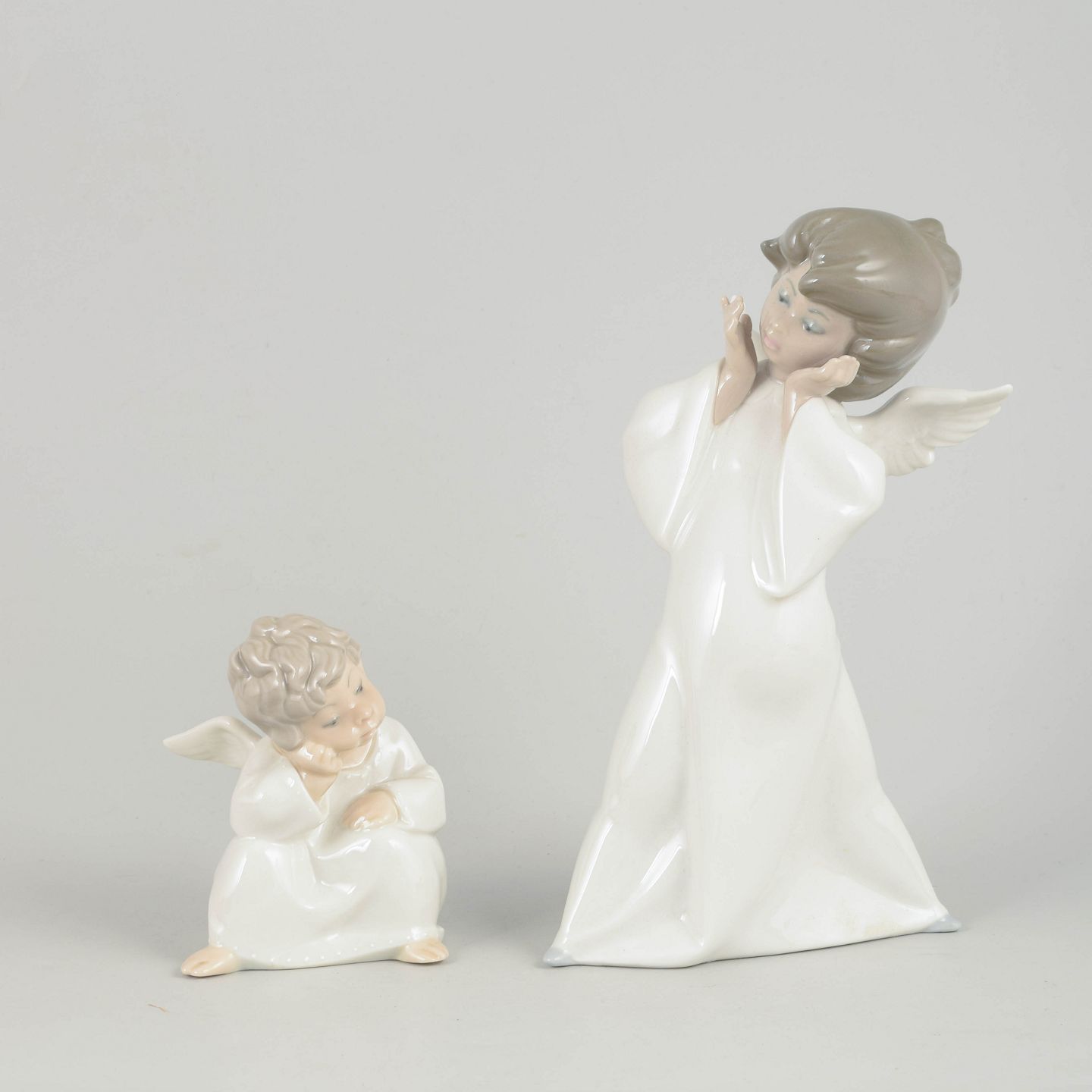 Lladró figur, sæt af to engle.To fine porcelænsfigurer forestillende engle i klassisk Lladró stil med bløde former og afdæmpede farver. Den ene stående og den anden siddende, begge med detaljeret modellering og karakteristisk glasur.