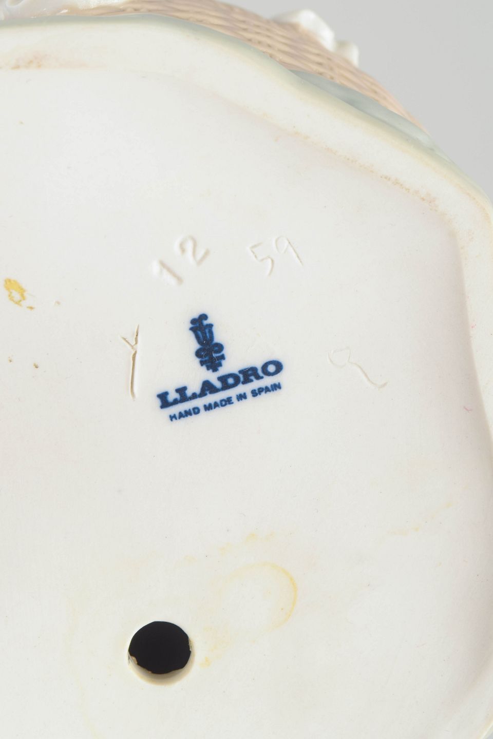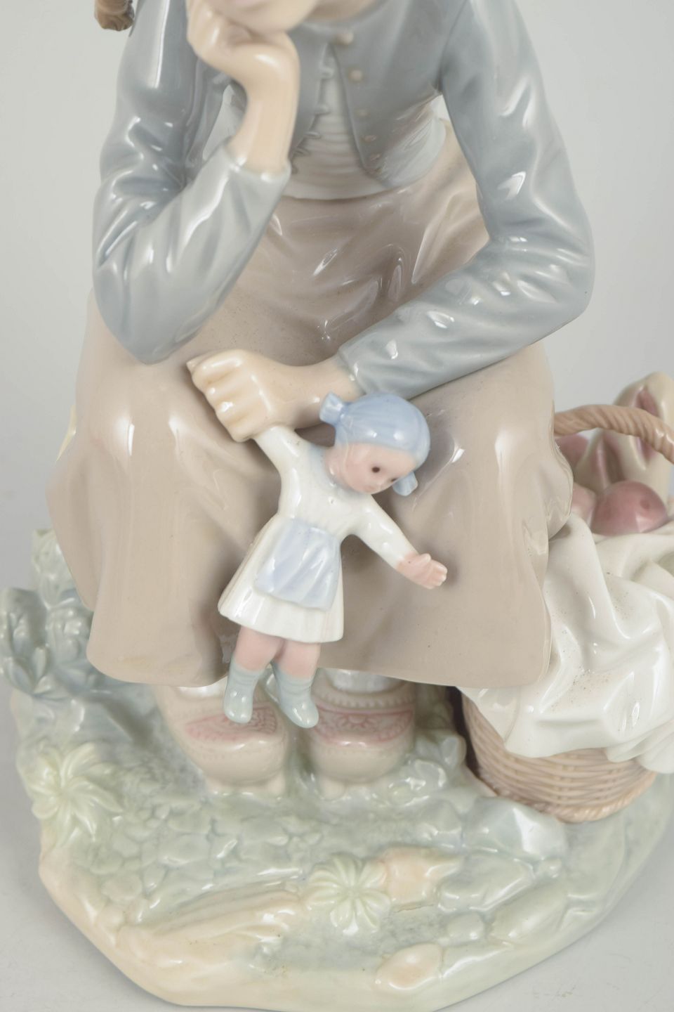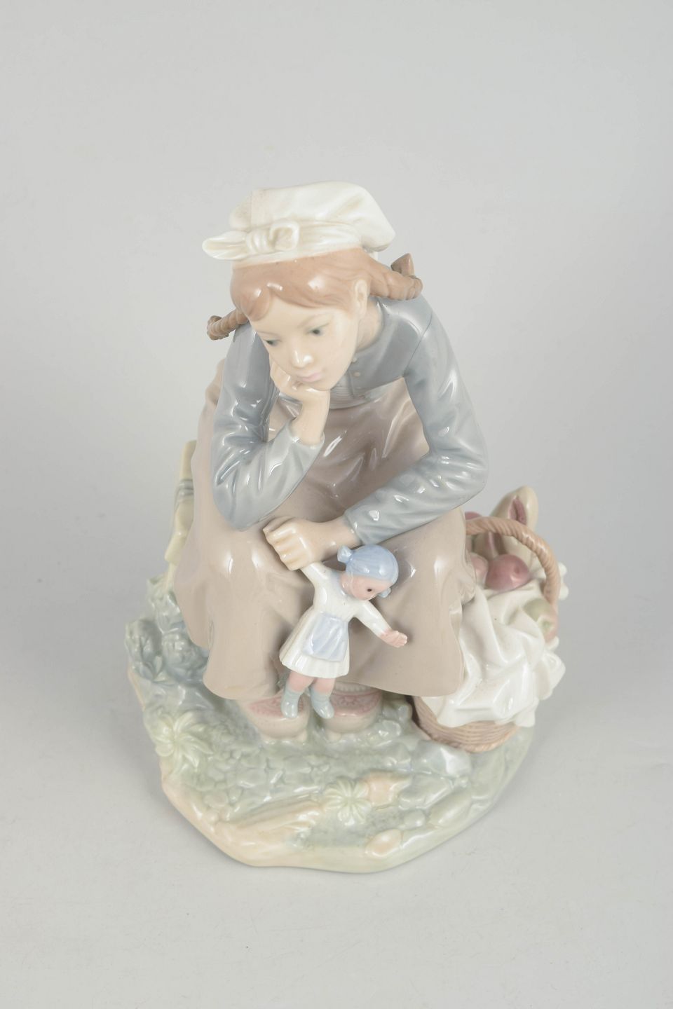 Lladró figur, siddende pige med dukke.Fin figur i porcelæn forestillende en eftertænksom pige siddende med en dukke ved sin side samt en kurv. Udført i bløde pastelfarver med karakteristisk glasur og detaljerigdom.