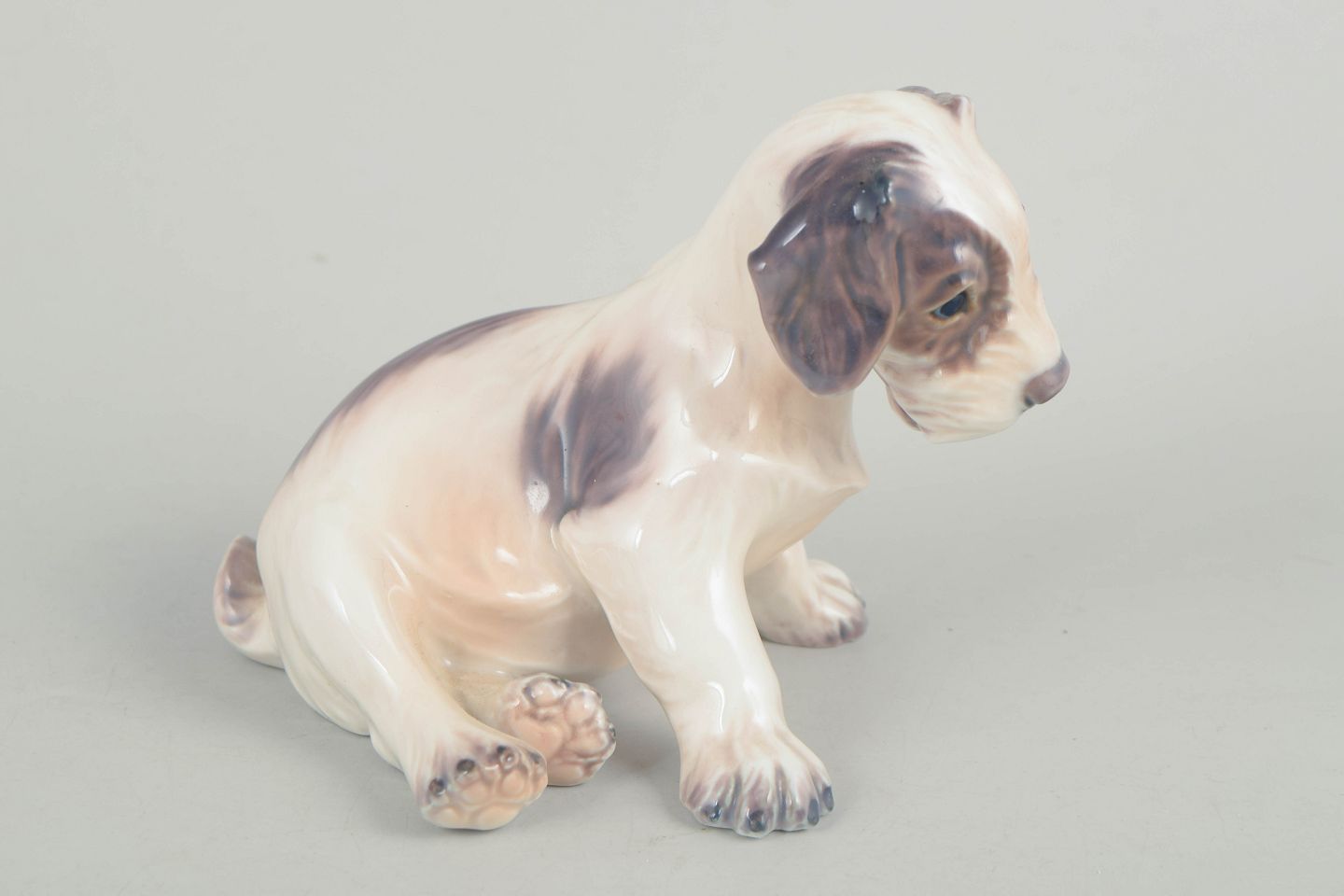 Dahl Jensen, porcelænsfigur af hund.Naturalistisk udført porcelænsfigur af siddende hund med bløde former og fint modellerede detaljer. Glaseret i afdæmpede nuancer med brungrå markeringer. Model 1008.