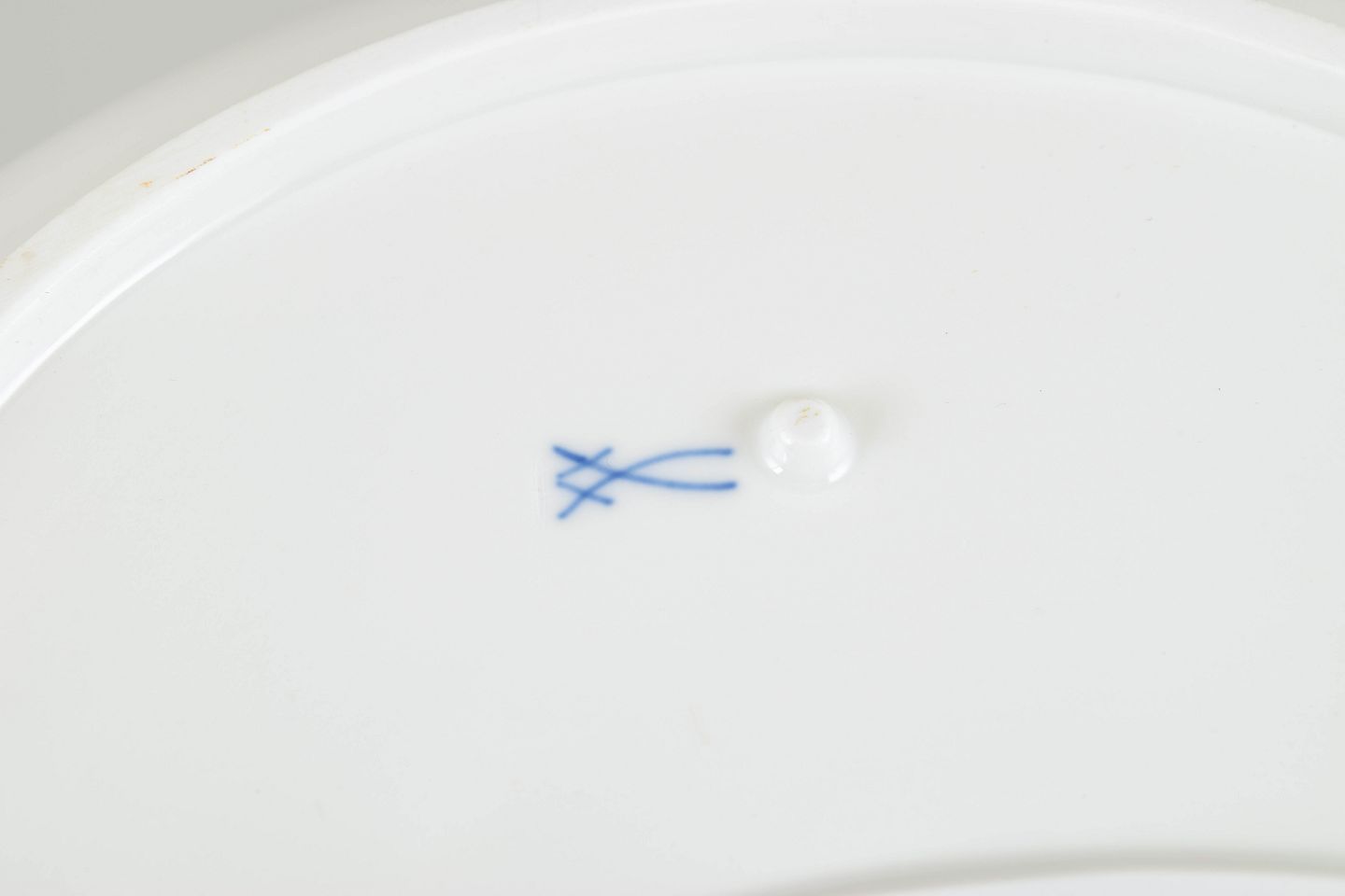 Meissen løgmønster, fad.Dekorativt fad i porcelæn med håndmalet blå dekoration i det klassiske løgmønster. Fremstillet hos Meissen i begyndelsen af 1900-tallet og markeret med Meissen krydssværd.