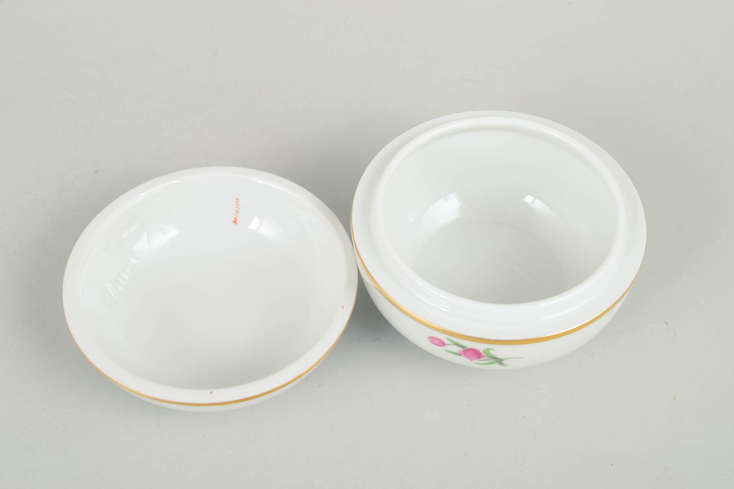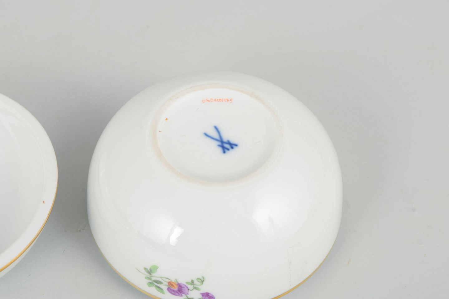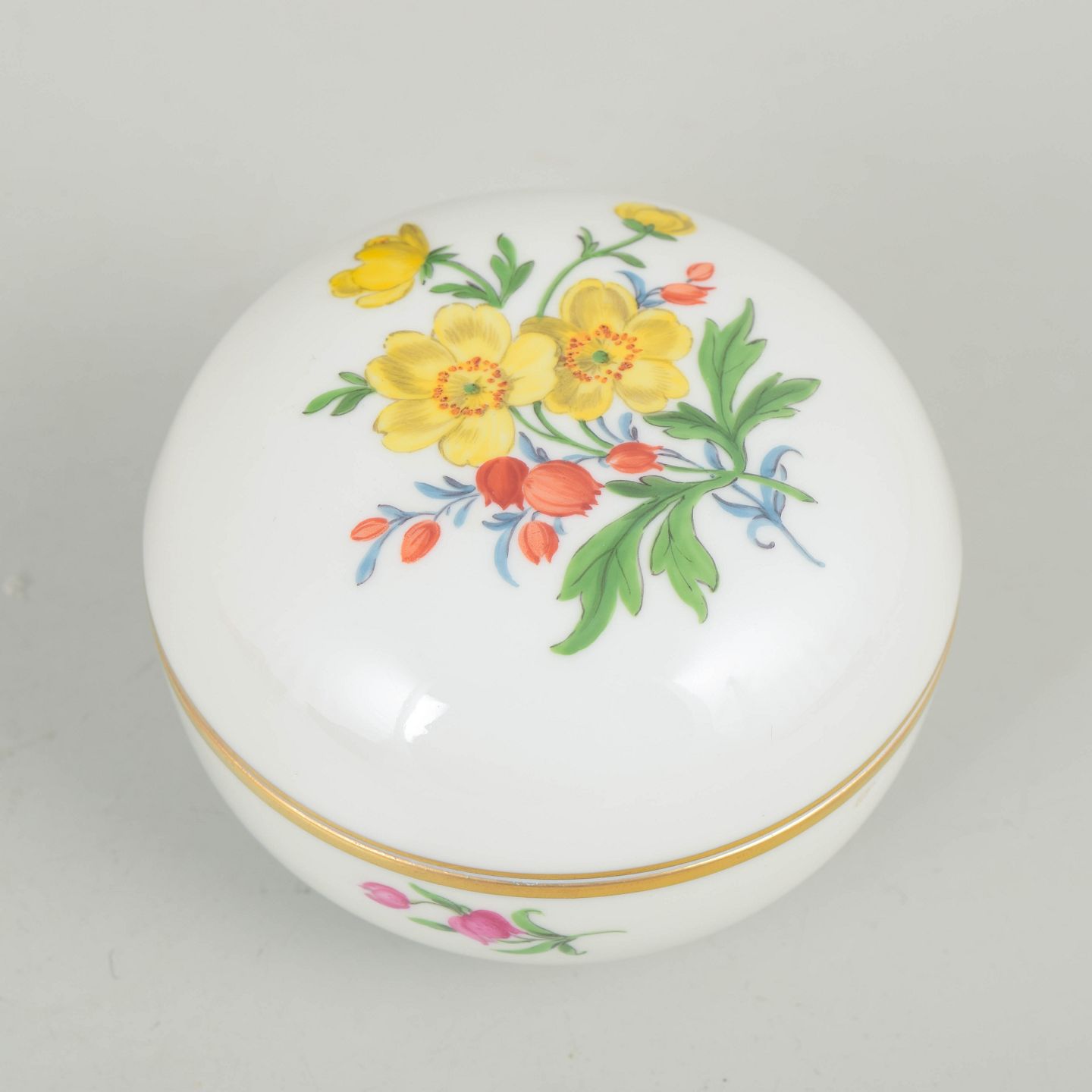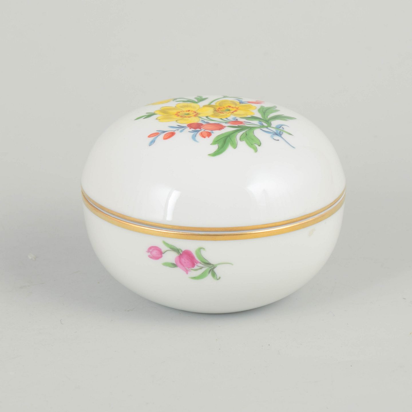 Lågkrukke i porcelæn håndmalet med polykrome blomster og dekoreret med guldkant. Harmonisk rund form med fint tilpasset låg og klassisk Meissen dekoration fra midten af det 20. århundrede. Undersiden mærket med Meissen krydssværd, første sortering.