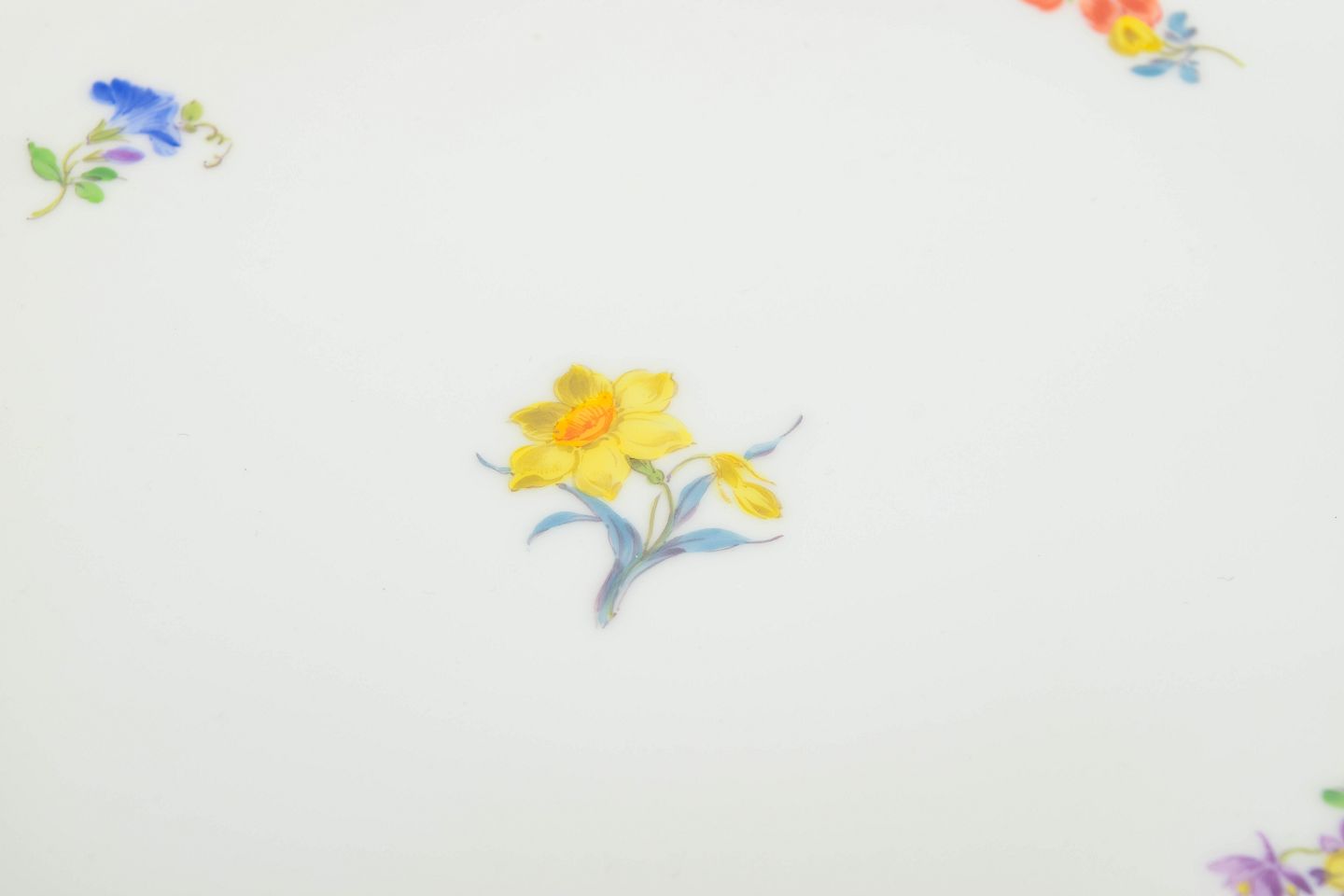 Stort rundt porcelænsfad håndmalet med spredte polykrome blomster og guldkant. Klassisk Meissen dekoration fra midten af det 20. århundrede, udført i fin kvalitet med let bølget rand. Undersiden mærket med Meissen krydssværd.