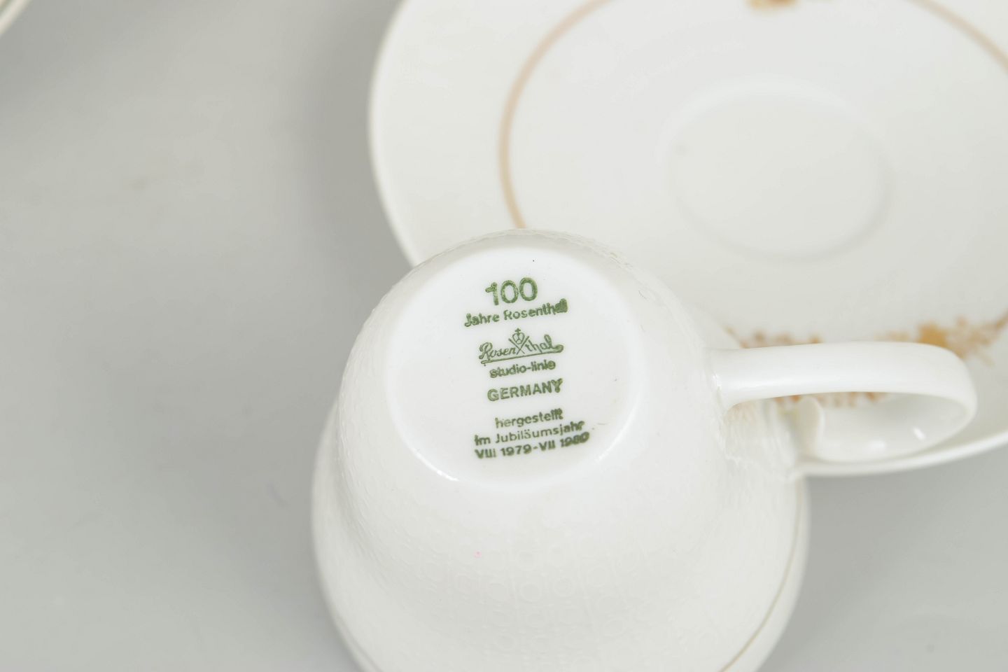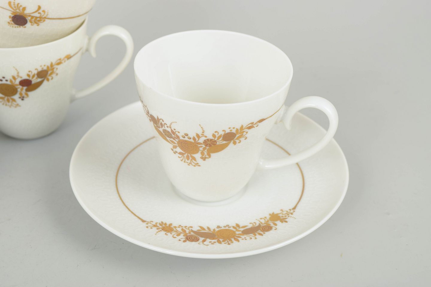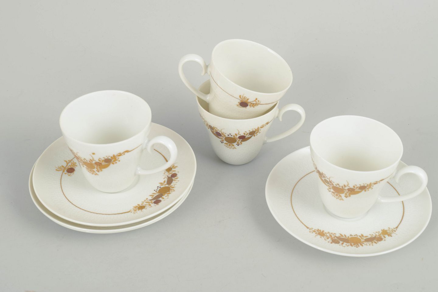Bjørn Wiinblad for Rosenthal, sæt af fire kaffekopper med underkopper.Sæt bestående af fire kaffekopper med tilhørende underkopper i porcelæn dekoreret med det karakteristiske blomsterornament fra Romanze-serien. Dekorationen fremstår i gyldne nuancer med fine detaljer og et elegant, romantisk udtryk, typisk for Wiinblads formsprog i 1970’erne.