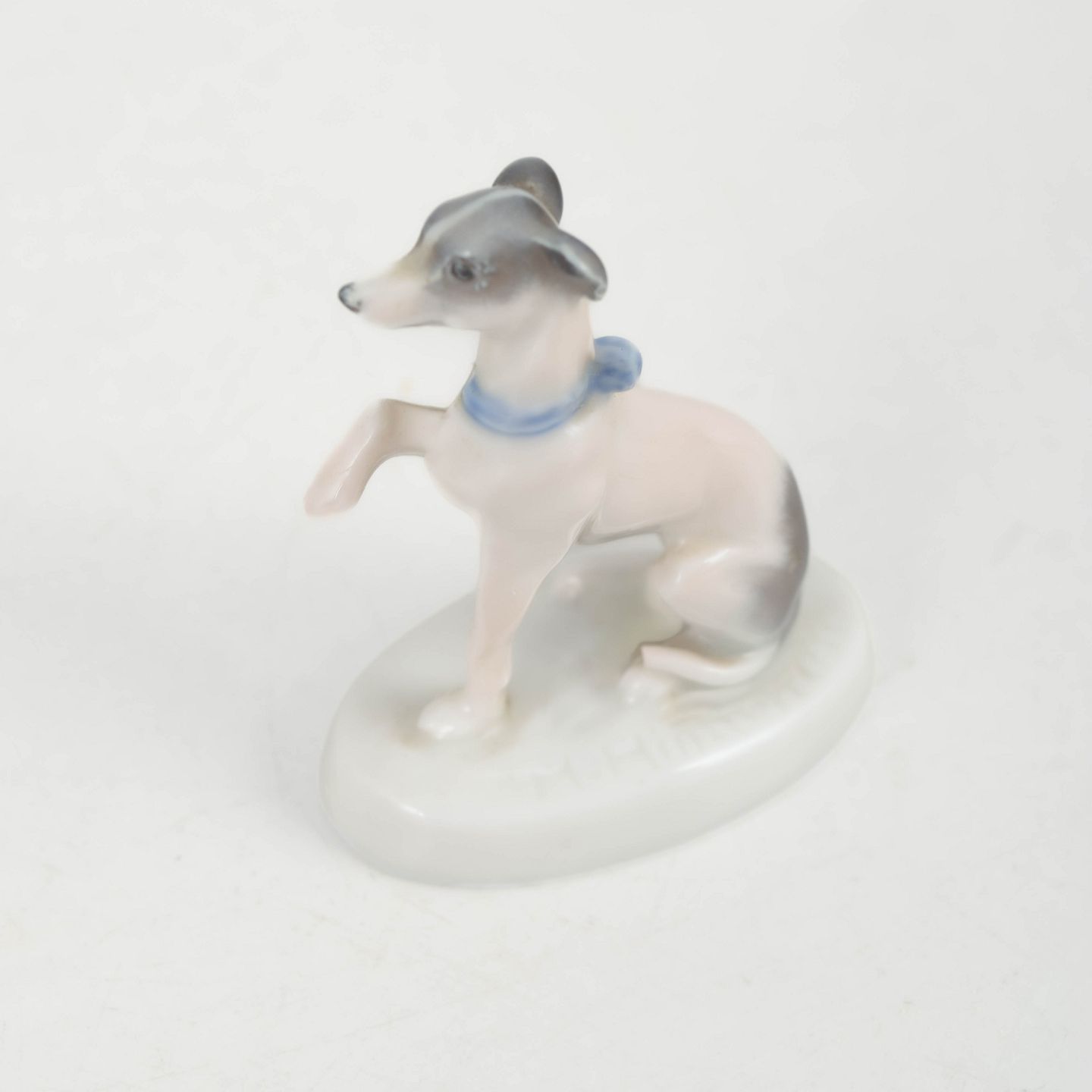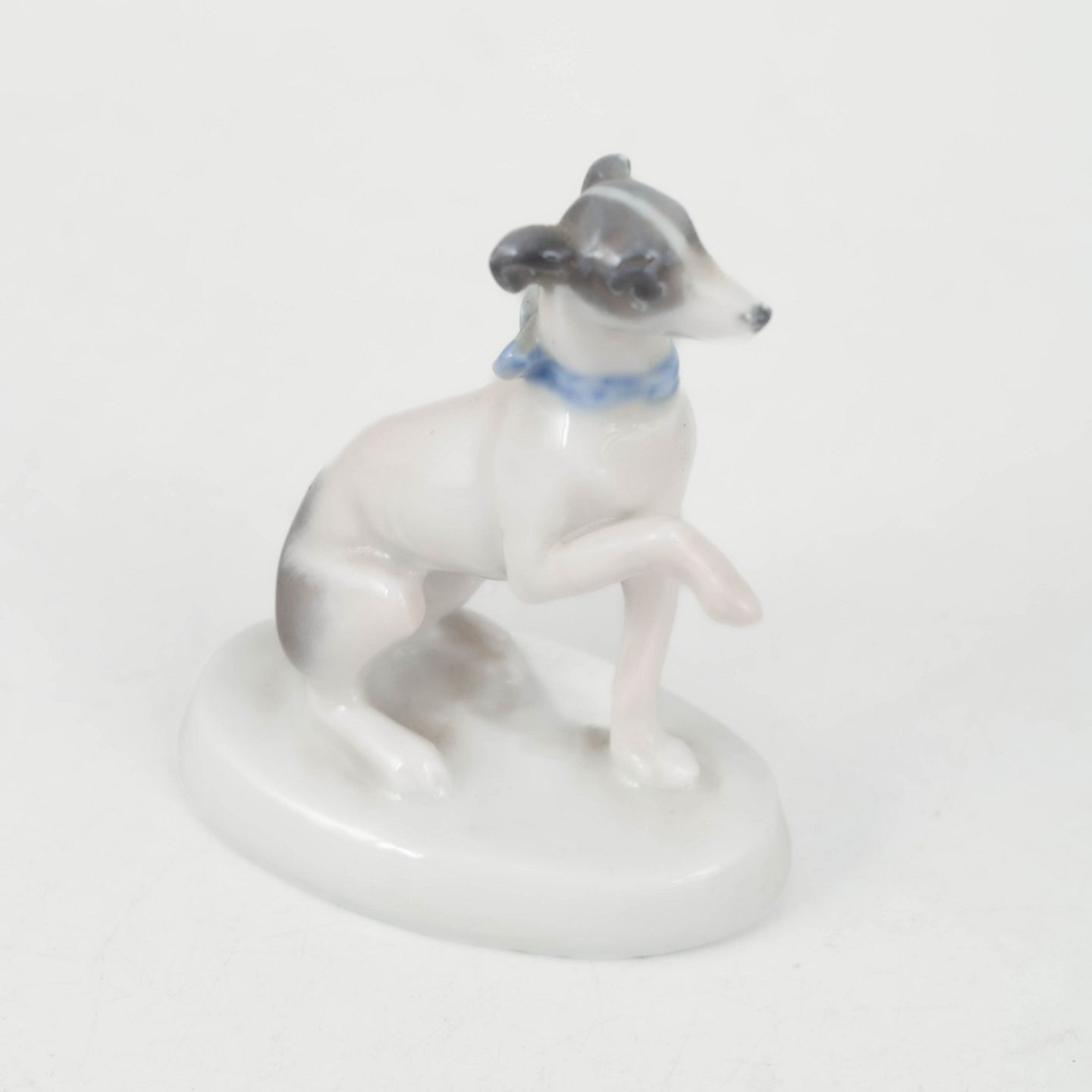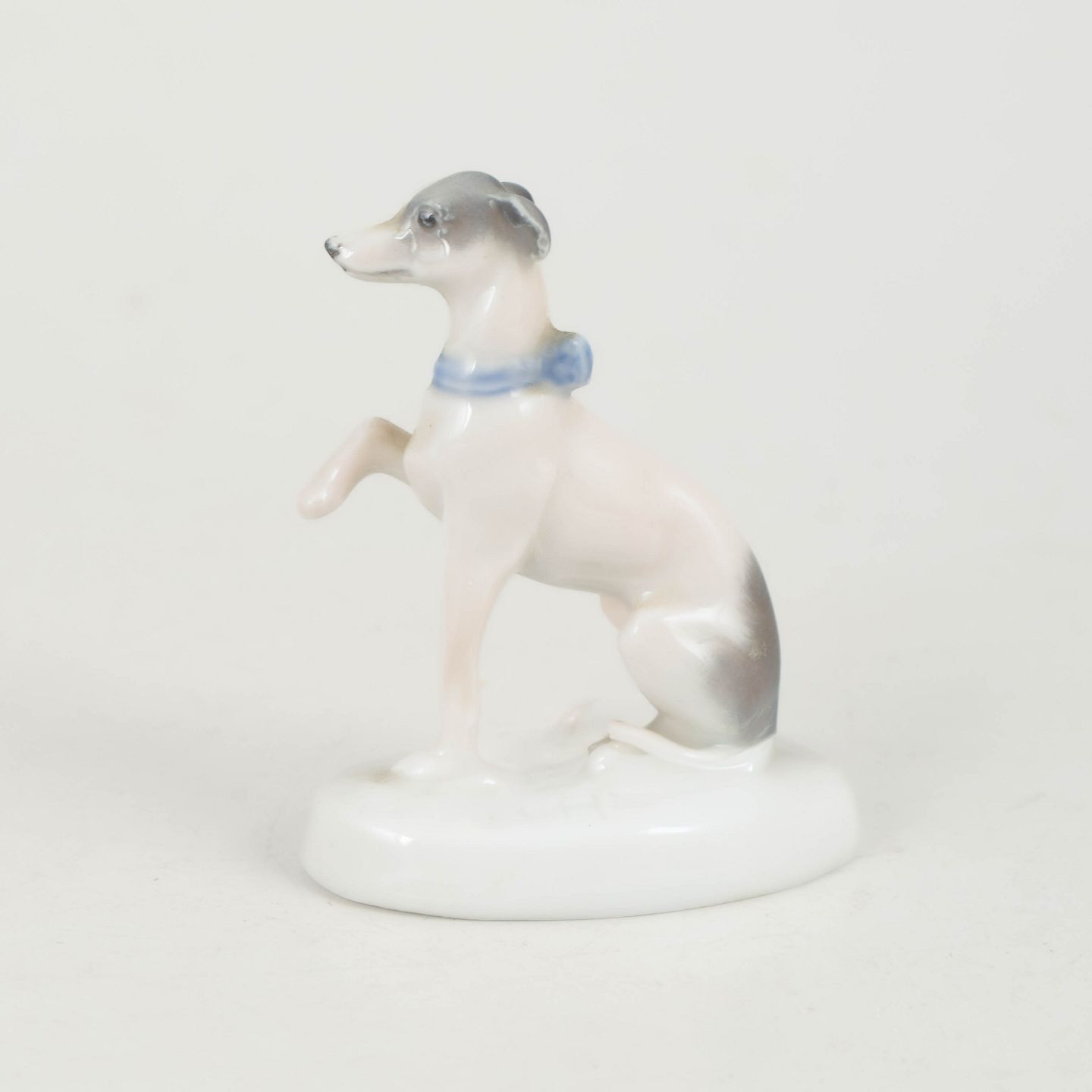 Rosenthal, mynde figur.Fin naturalistisk porcelænsfigur af en siddende mynde med hævet forpote og elegant slank form. Udført med bløde glasurovergange i lyse toner og signeret R. Sh., fremstillet hos Rosenthal i perioden omkring 1927.