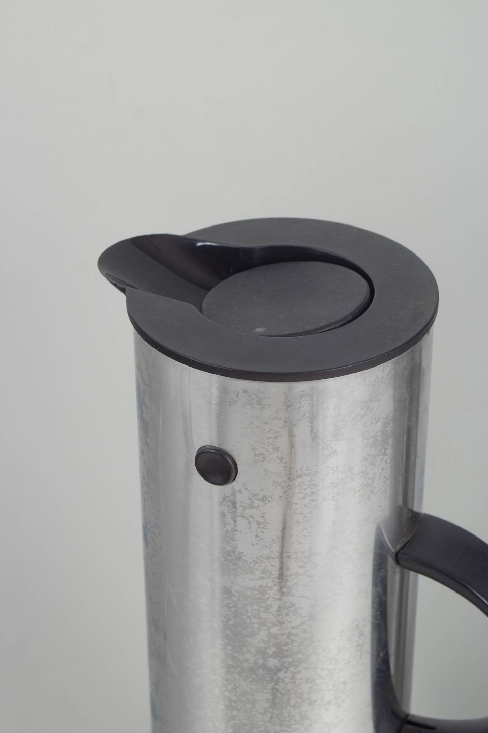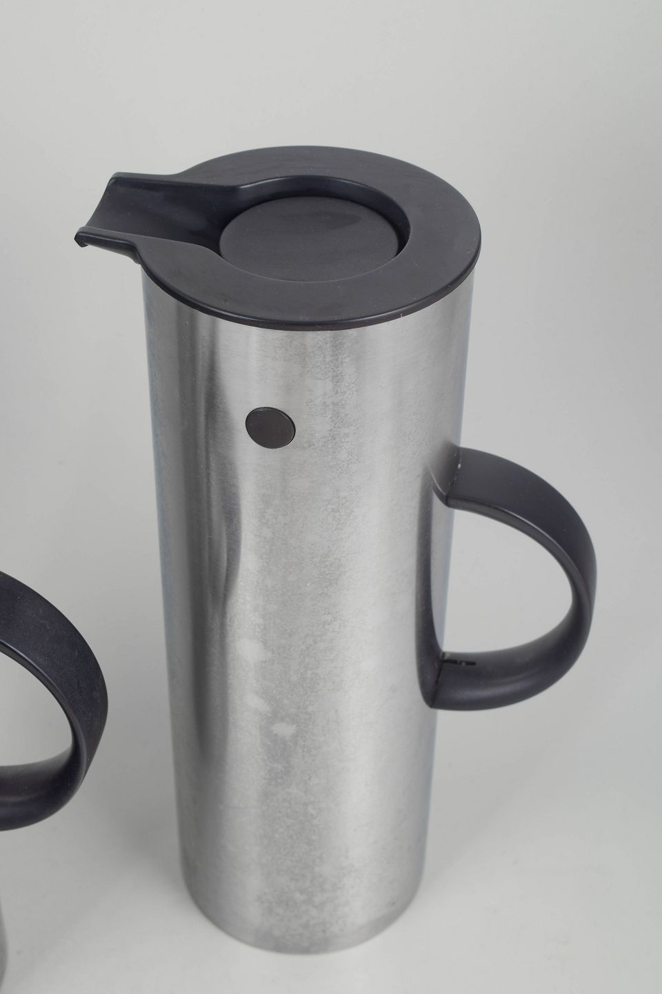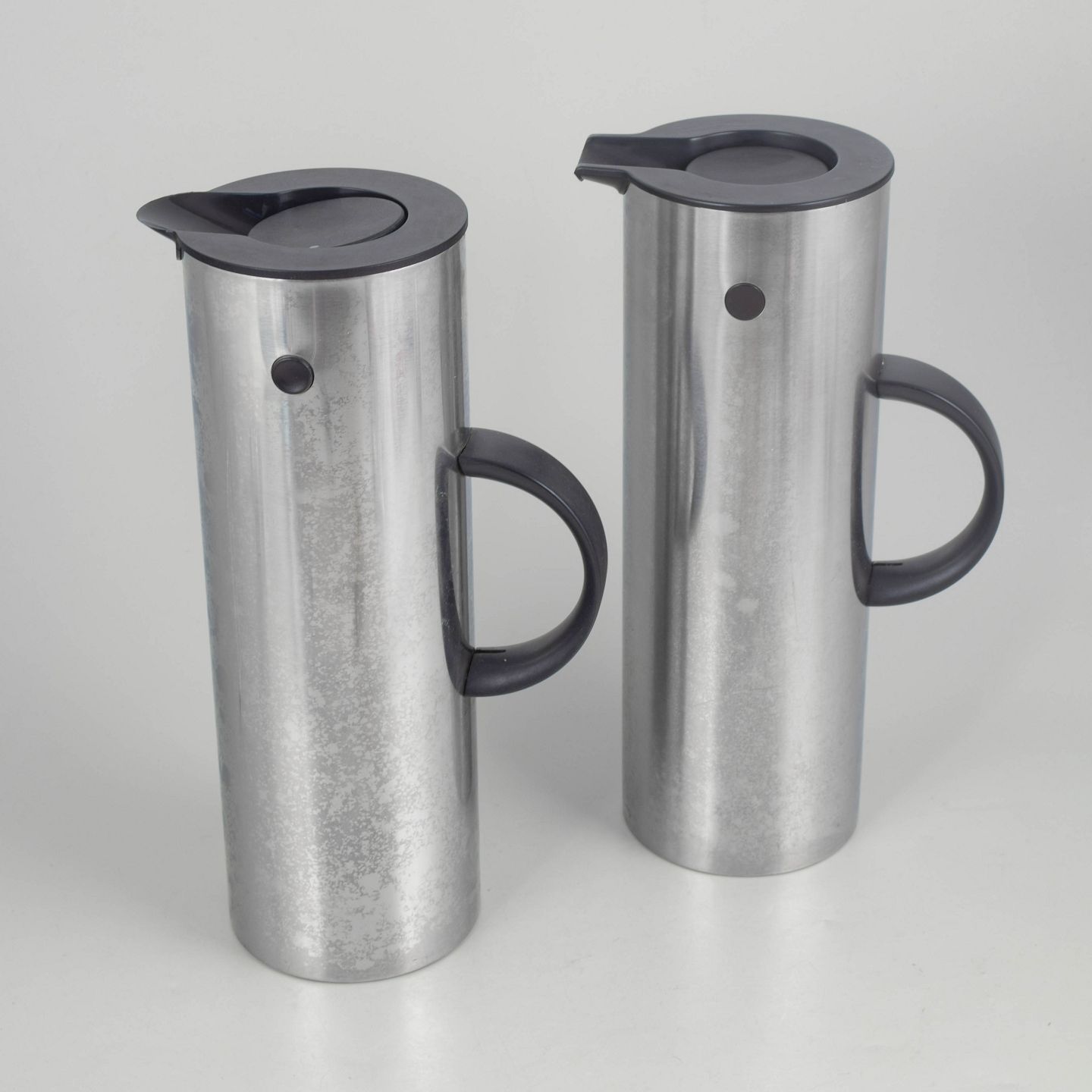 Erik Magnussen for Stelton, termokander i rustfrit stål.To cylindriske termokander i børstet rustfrit stål med karakteristisk vippeprop og sort kunststofhank. Model fra Steltons ikoniske serie, designet med fokus på funktionalitet og minimalistisk formgivning.