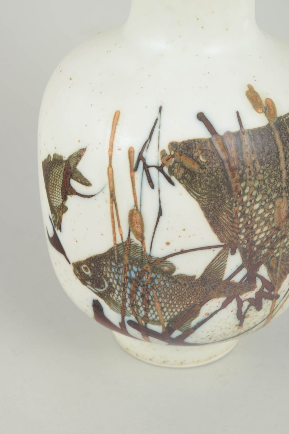 Nils Thorsson for Royal Copenhagen, stor stentøjsvase.Stor vase i stentøj dekoreret med stiliseret havbundsmotiv med fisk og vegetation i dæmpede brunlige, blå og grønne nuancer. Modellenummer 1064 / 5363. Første sortering med original fabriksmærkat.