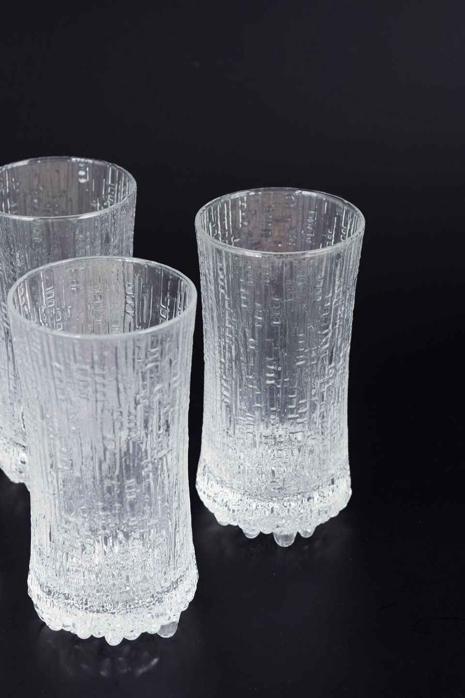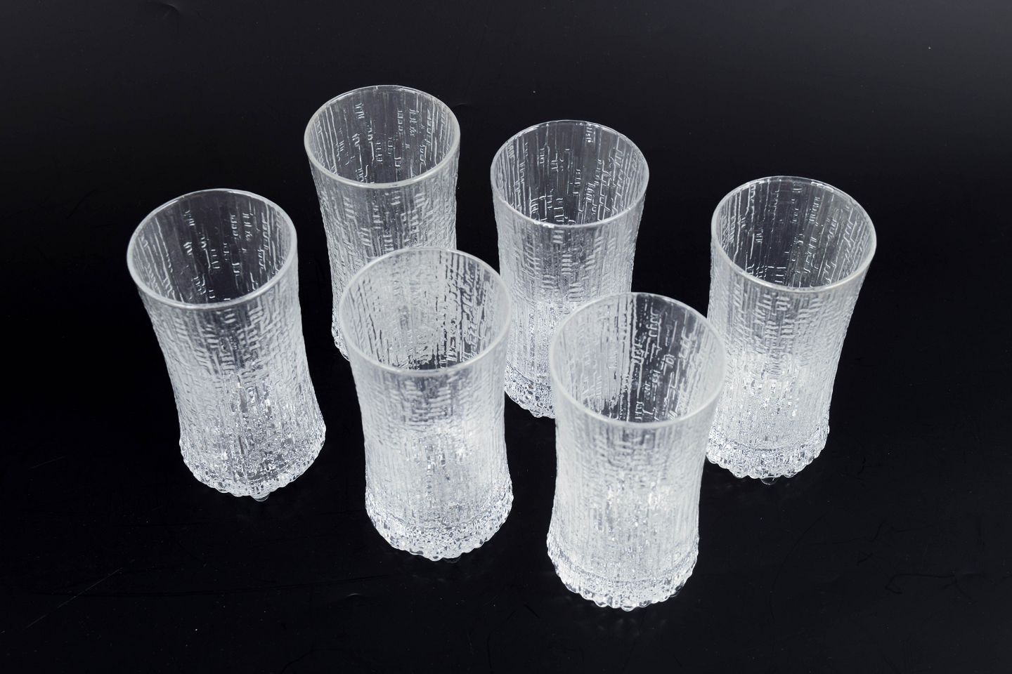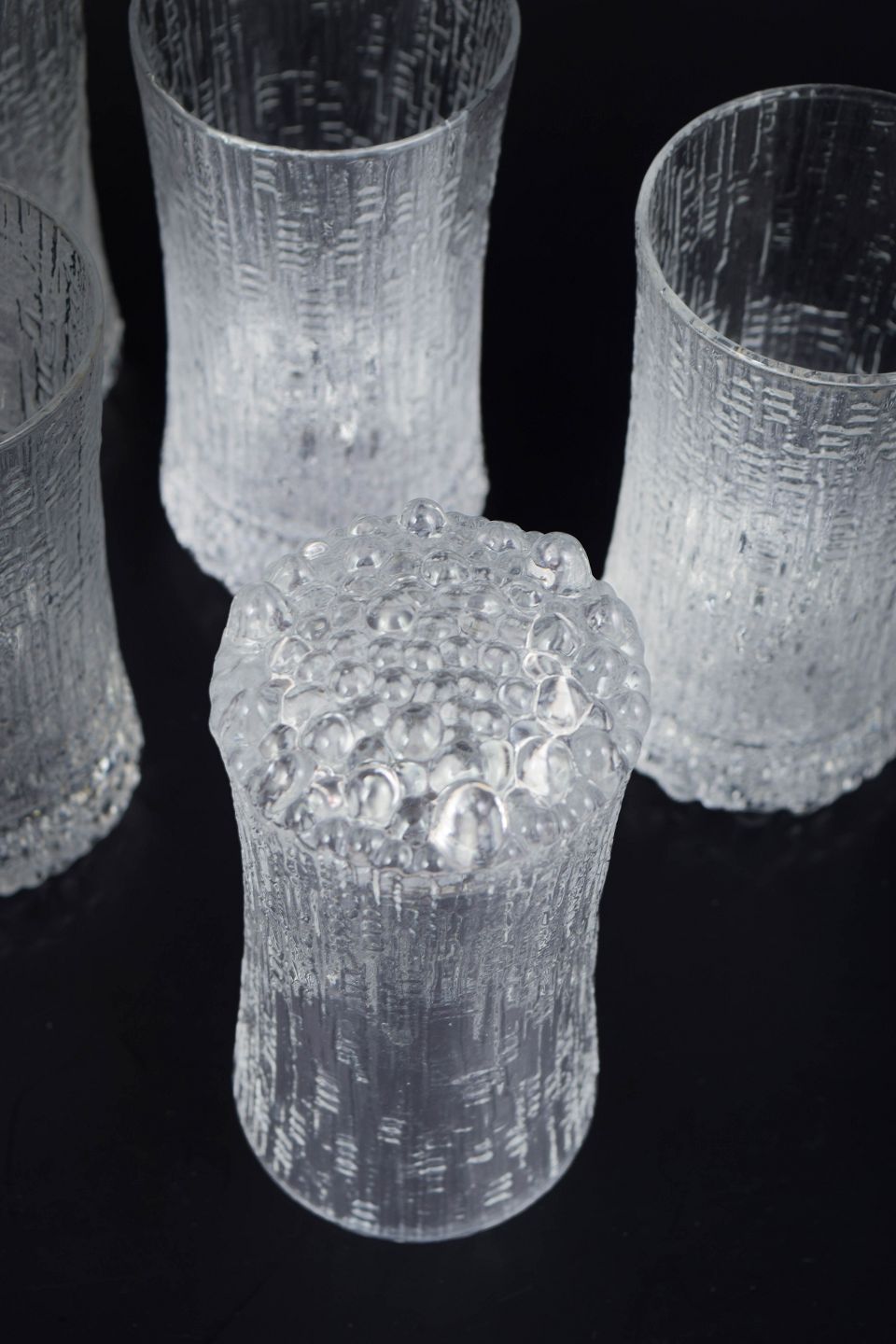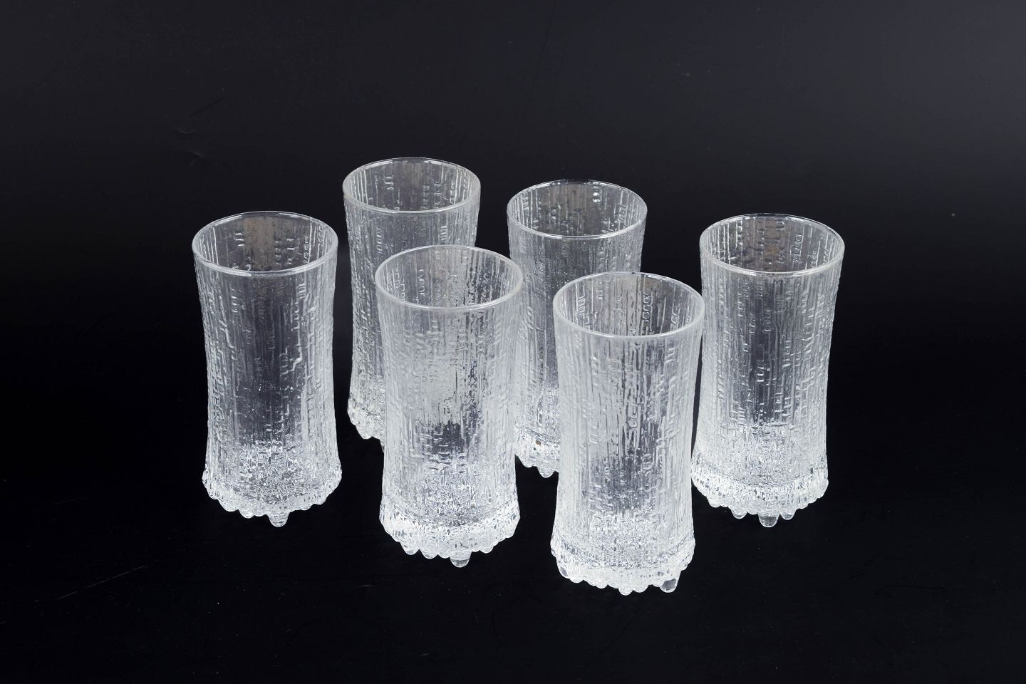 Tapio Wirkkala for Iittala, sæt af seks drikkeglas.Drikkeglas fra Ultima Thule-serien i klart glas med karakteristisk isstruktur og organisk form, inspireret af smeltende is i nordisk natur, designet i 1970’erne.