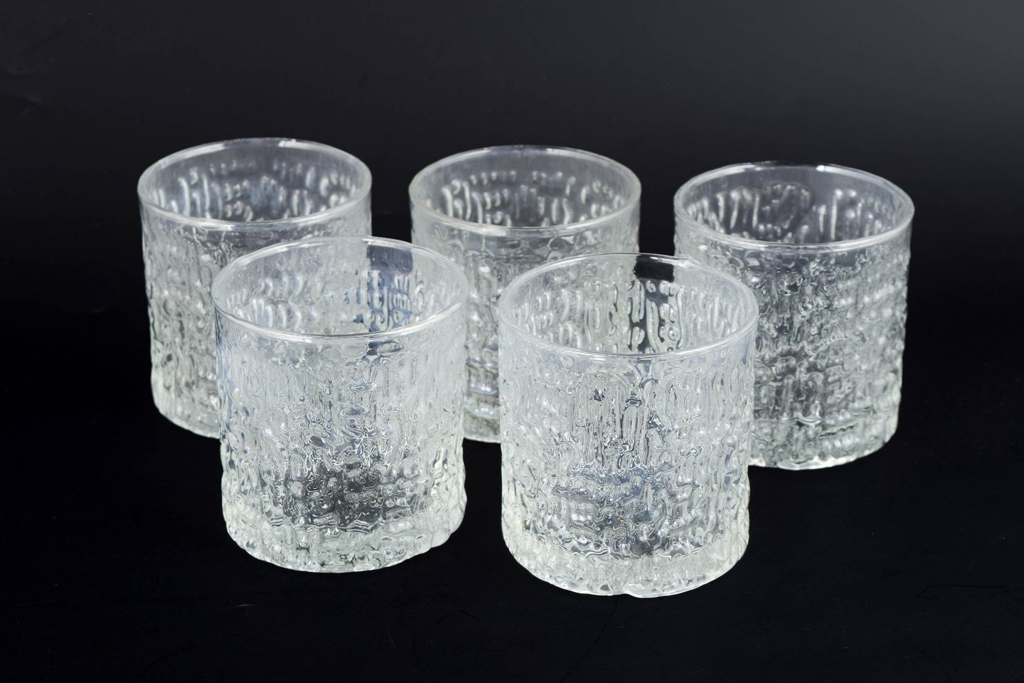Ravenhead, sæt af fem whiskyglas “Siesta”.Klassiske whiskyglas i klart presset glas med dekorativ struktur og kraftig bund, model “Siesta”. Produceret i England i 1980’erne.