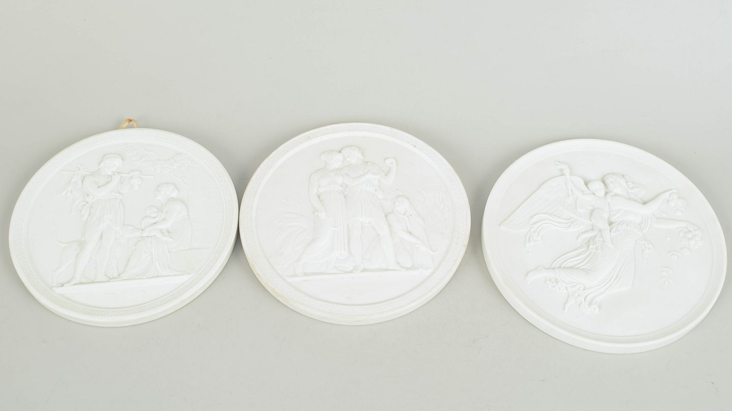 Royal Copenhagen, sæt af tre biscuit vægrelieffer efter Thorvaldsen.Beschreibung:
