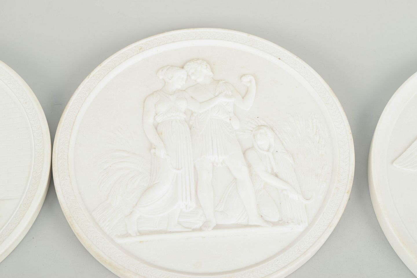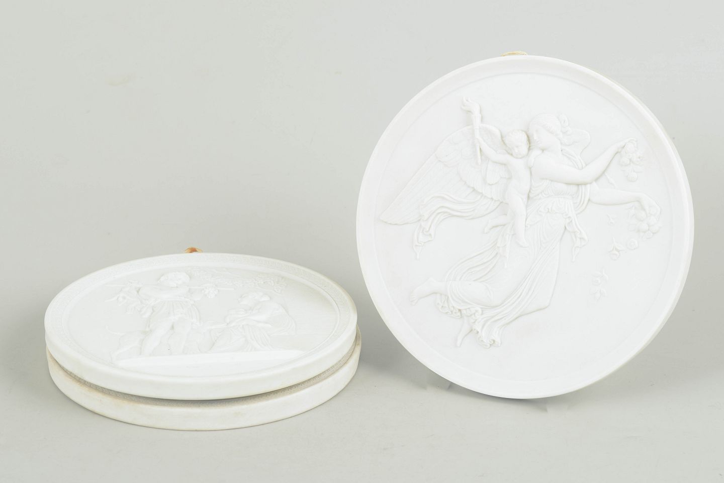 Royal Copenhagen, sæt af tre biscuit vægrelieffer efter Thorvaldsen.Relieffer i hvidt uglaseret porcelæn med klassiske motiver efter Bertel Thorvaldsen, udført i fin biscuit med detaljeret figurdekoration og ophæng på bagsiden. Første sortering.