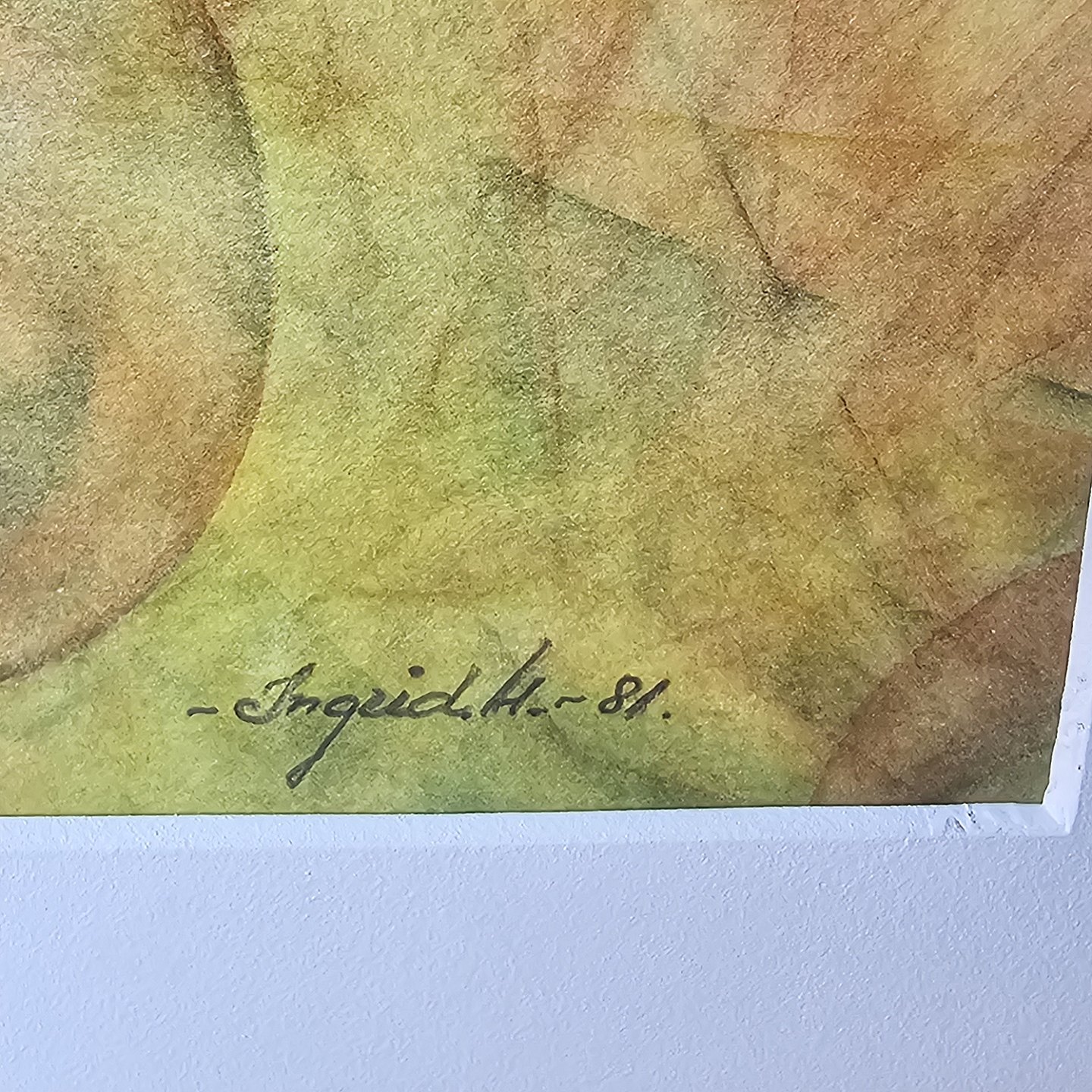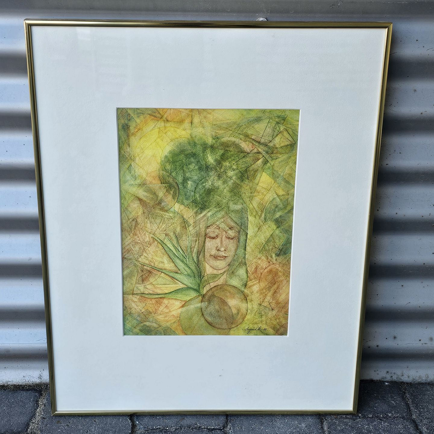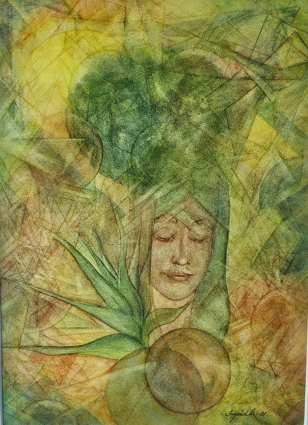 Tryk på papir med motiv af en kvinde i grønne nuancer. Monteret i metalramme, dateret 1981Kunstner Ingrid Houlberg, signeret