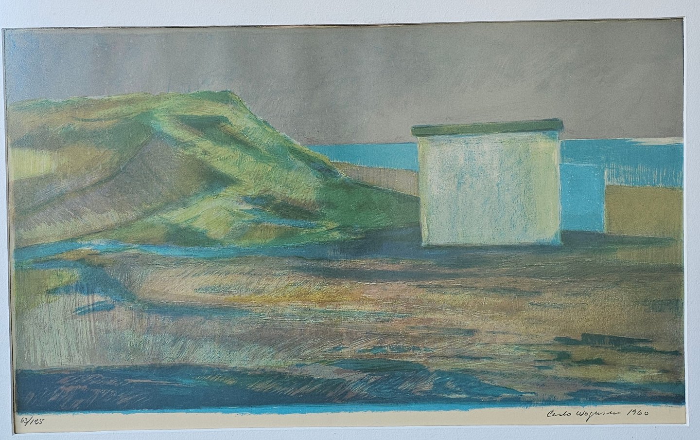 Litografi med motiv af et skur i et landskab monteret i guldmalet træramme. Nr. 63/125 og dateret 1960Kunstner Carlo Wognsen (1916-1979), signeret