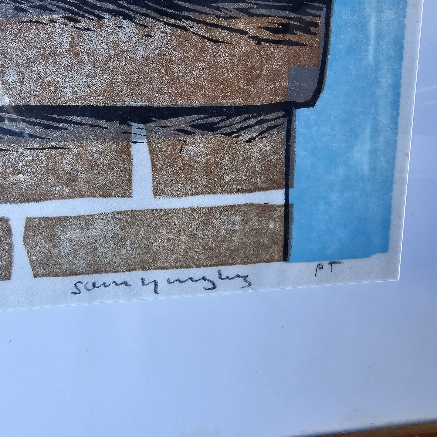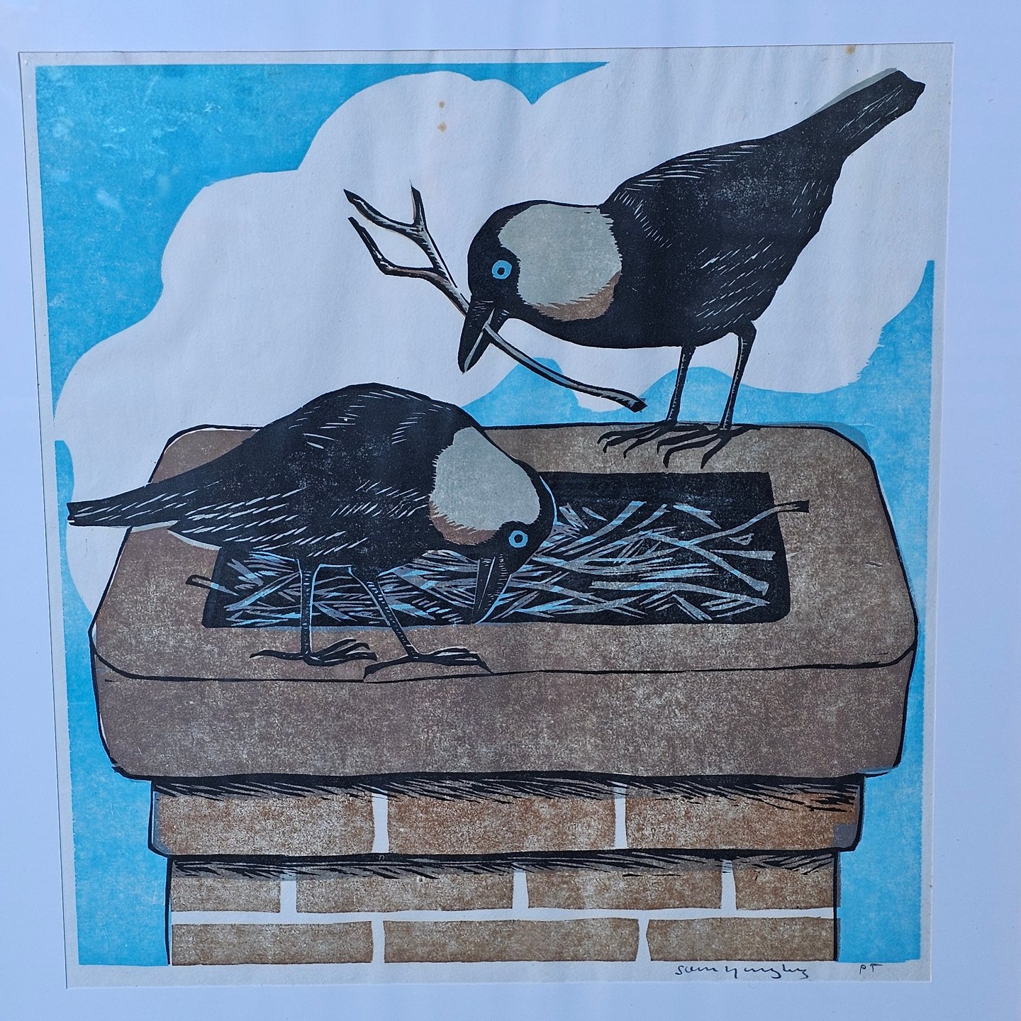 Prøvetryk med titlen "Sådan bygger vi" med motiv af to fugle der bygger rede. Monteret i trærammeKunstner Sven Ljungberg (1913-2010), signeret