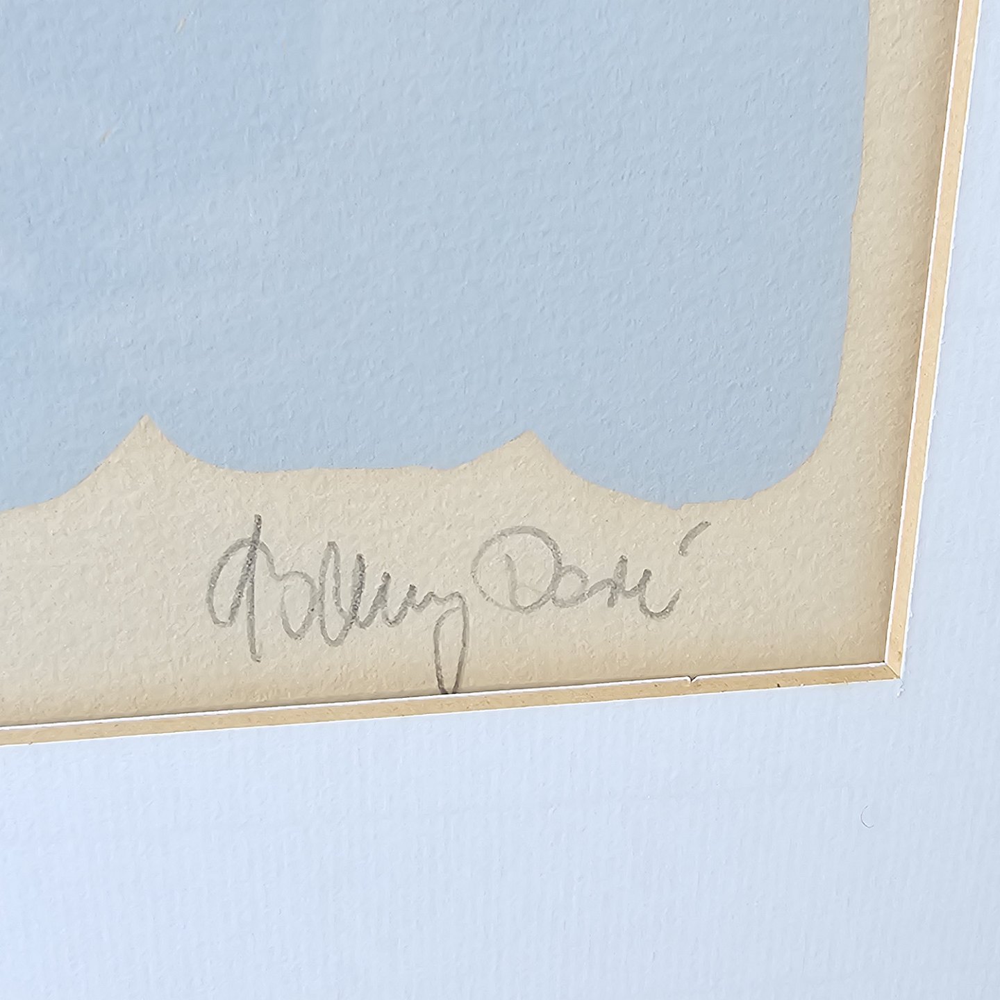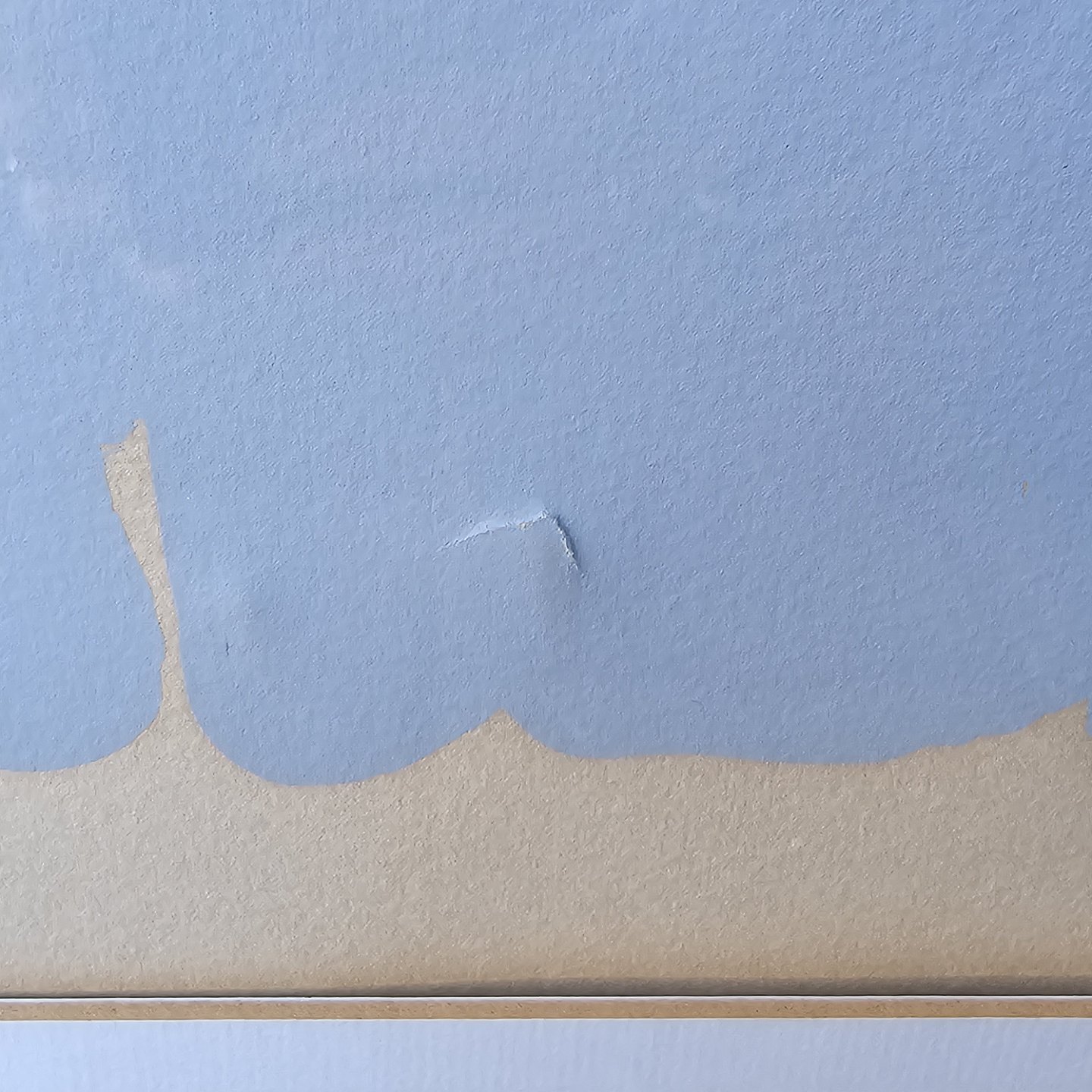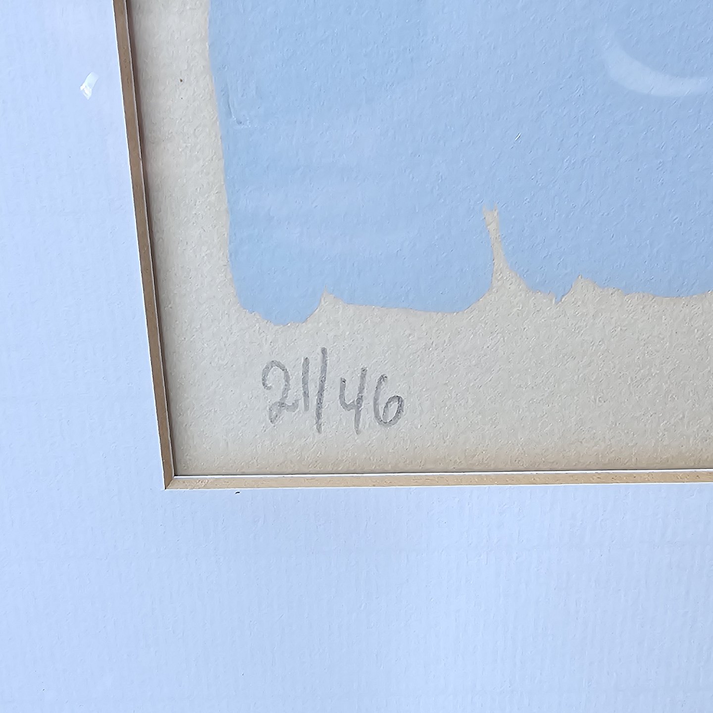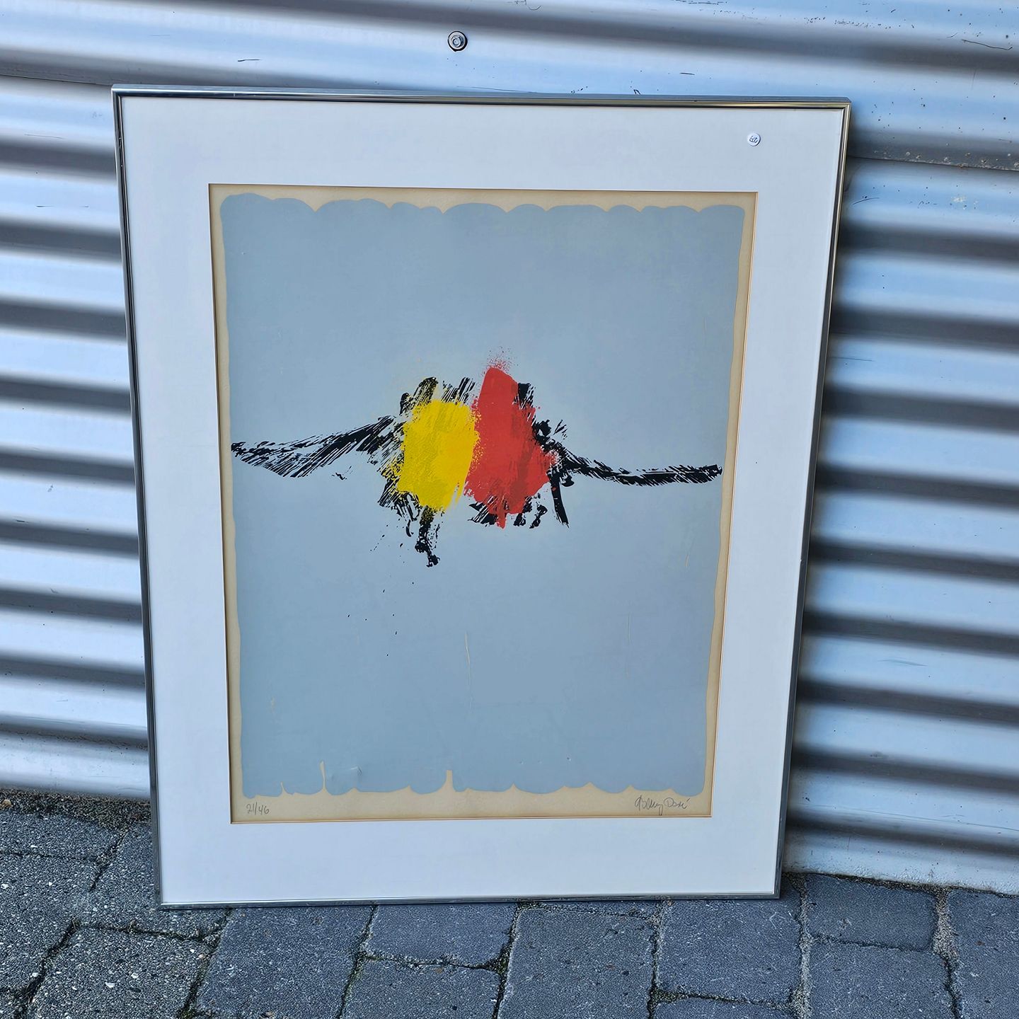 Litografi på papir med abstrakt motiv i sort, gul og rød monteret i sølv rammeVi har to styk