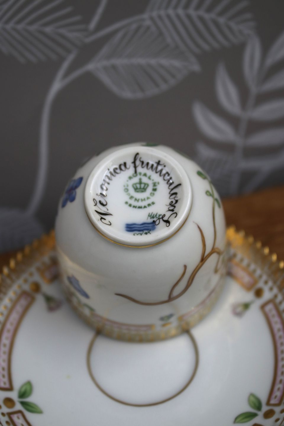 Mocca kop uden hank med underkop i Flora Danica-stel fra Royal Copenhagen.