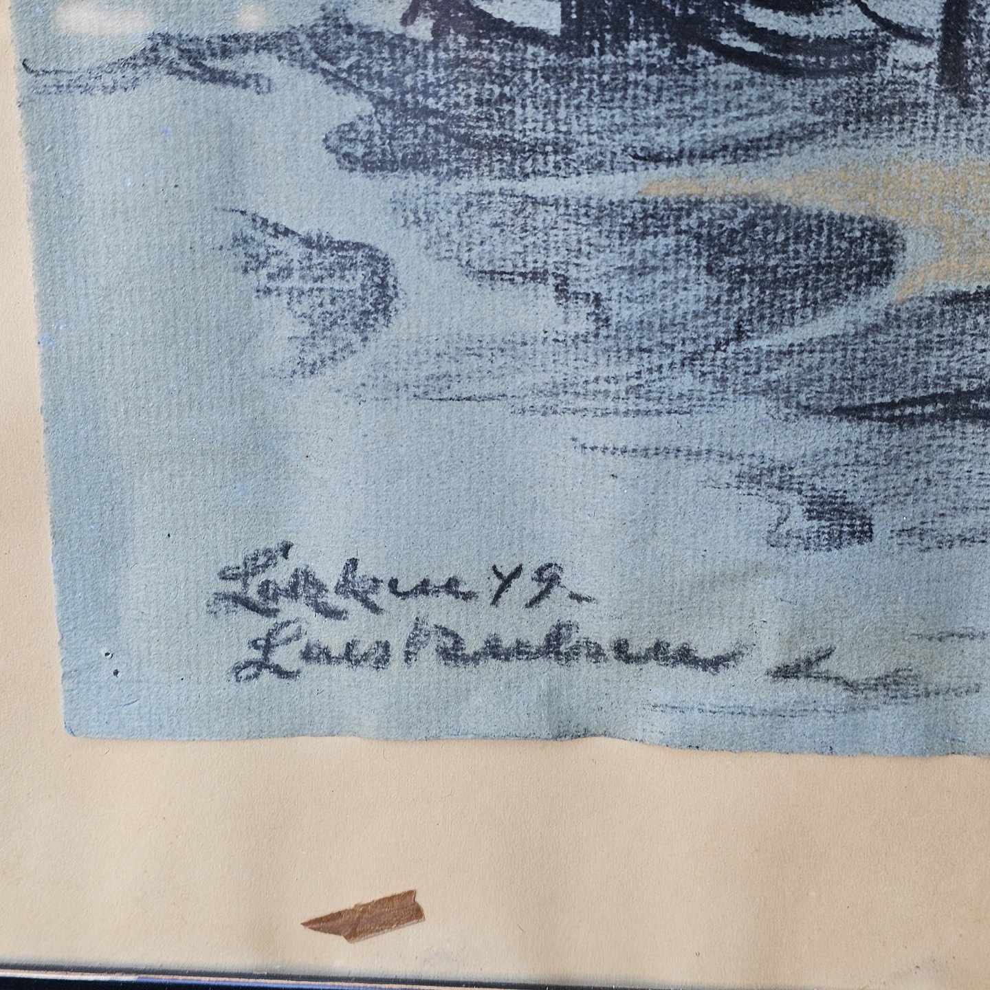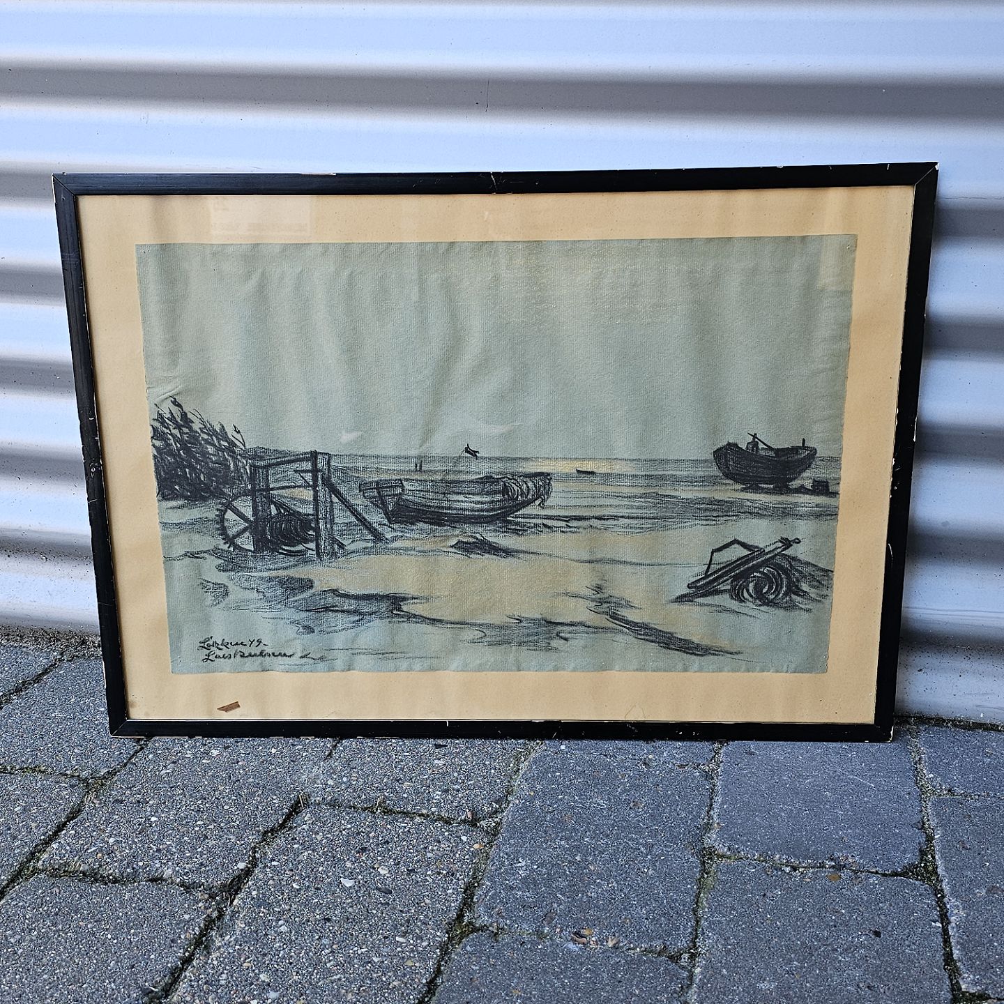 Kul eller kridt tegning på papir med motiv af både på en strand i Løkken. Monteret i sortmalet træramme, dateret 1949Kunstner Lars Nielsen (1883-1965), signeret