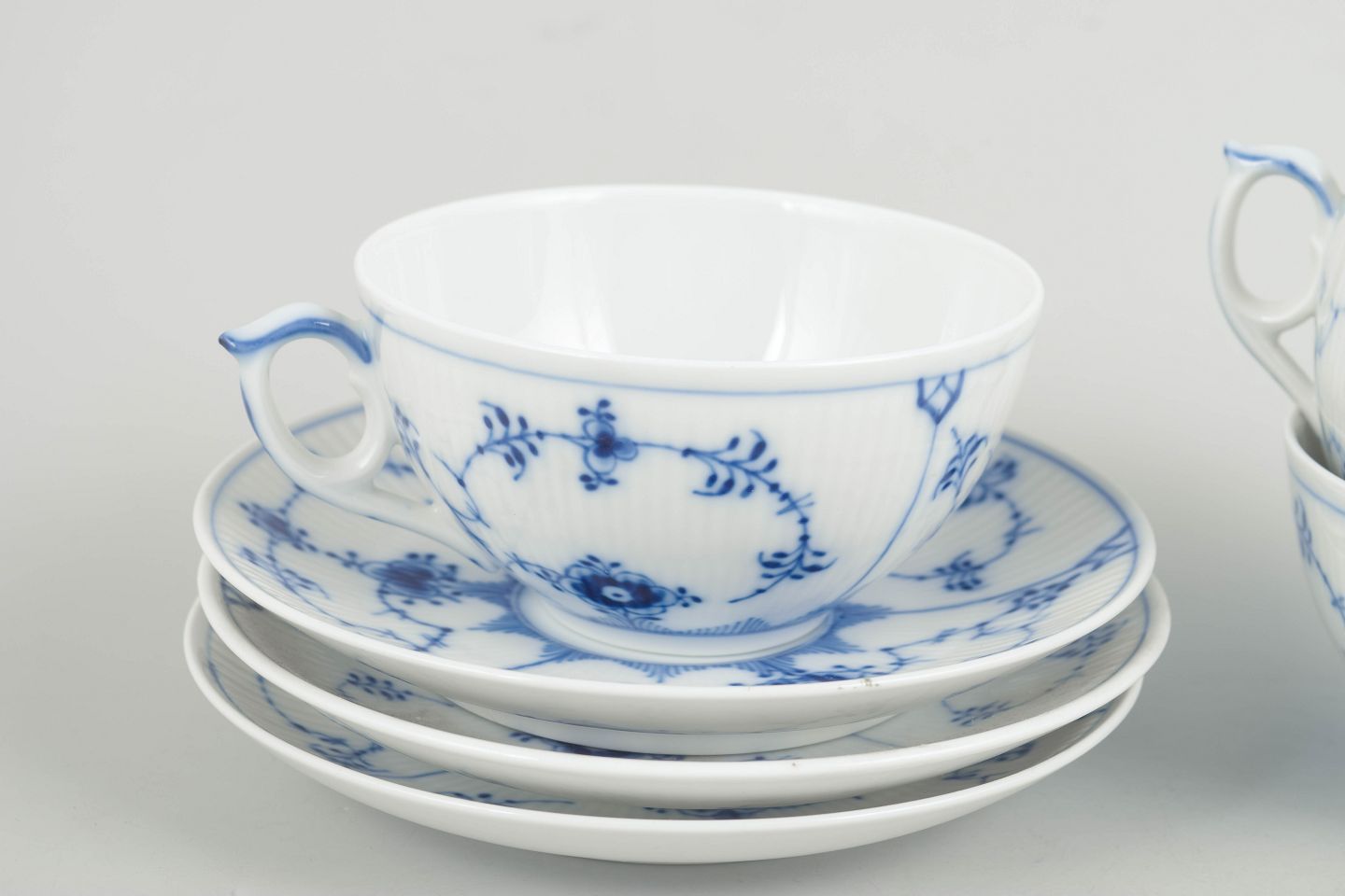 Royal Copenhagen Musselmalet Riflet, sæt af tre tekopper med underkopper.Beschreibung: