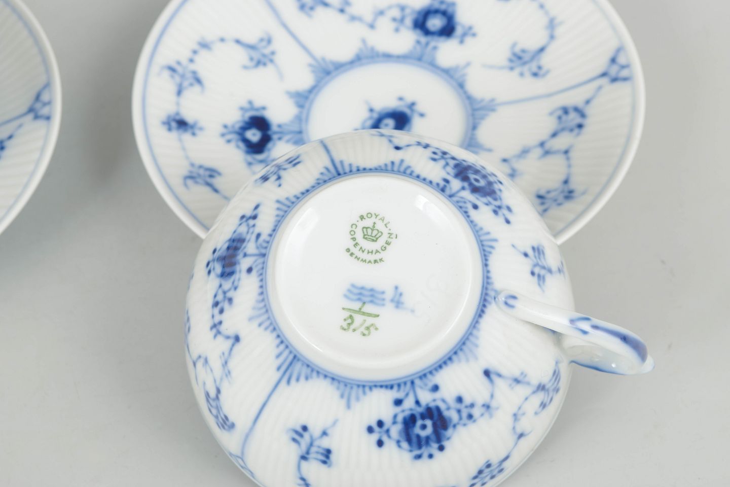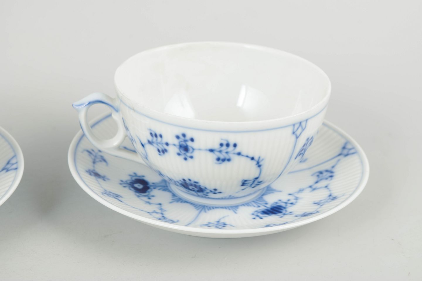 Royal Copenhagen Musselmalet Riflet to tekopper med underkopper.Beschreibung: