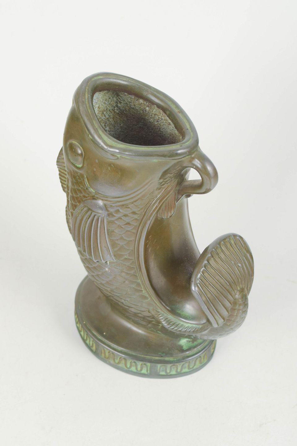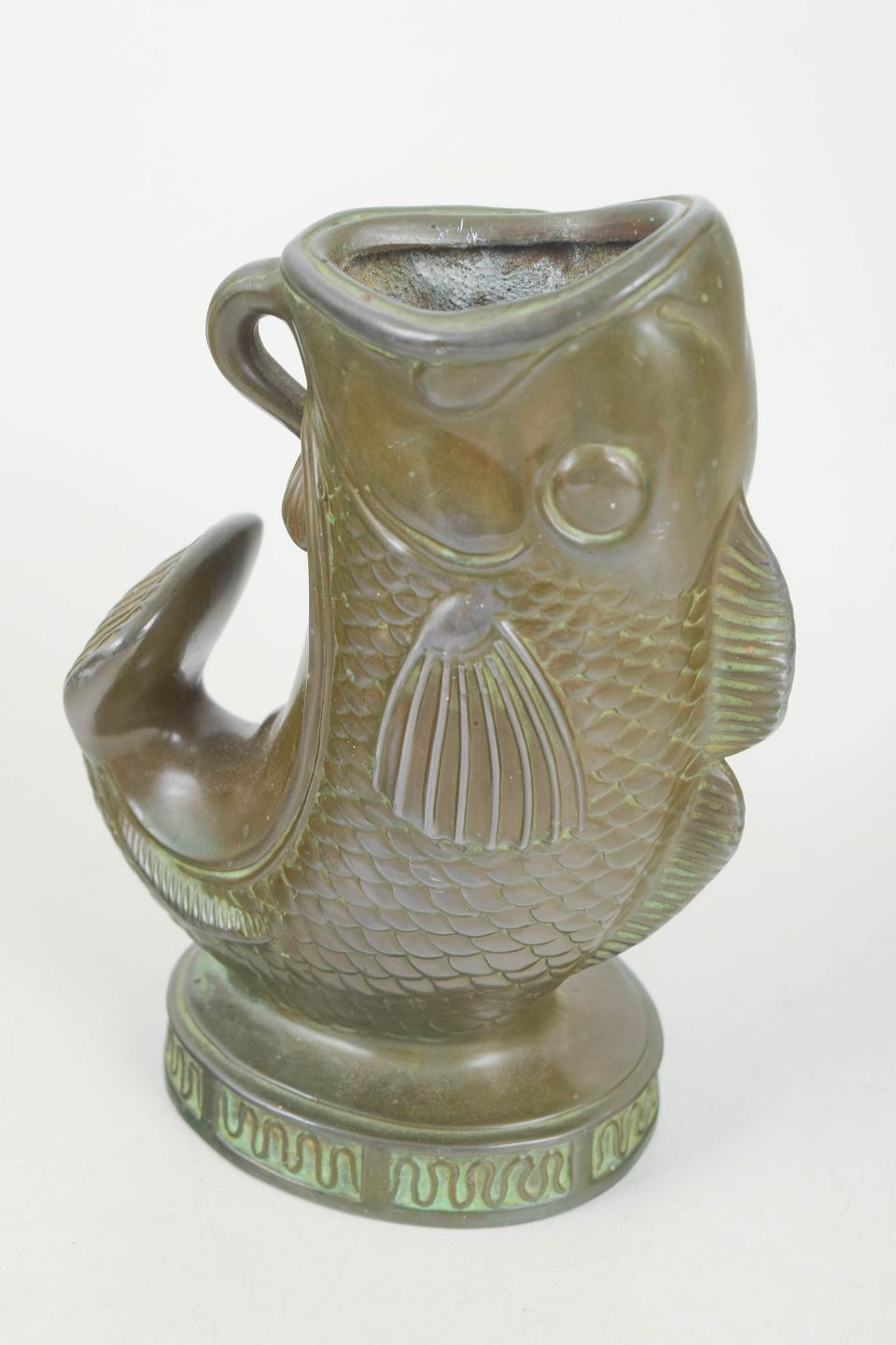 Just Andersen, fiskefigur i diskometal.Skulpturel fiskefigur i diskometal udført i et markant og dekorativt art deco formsprog. Model 2193.