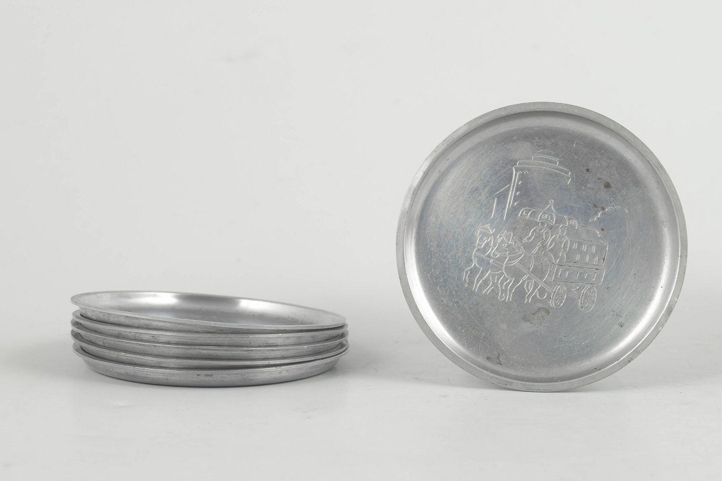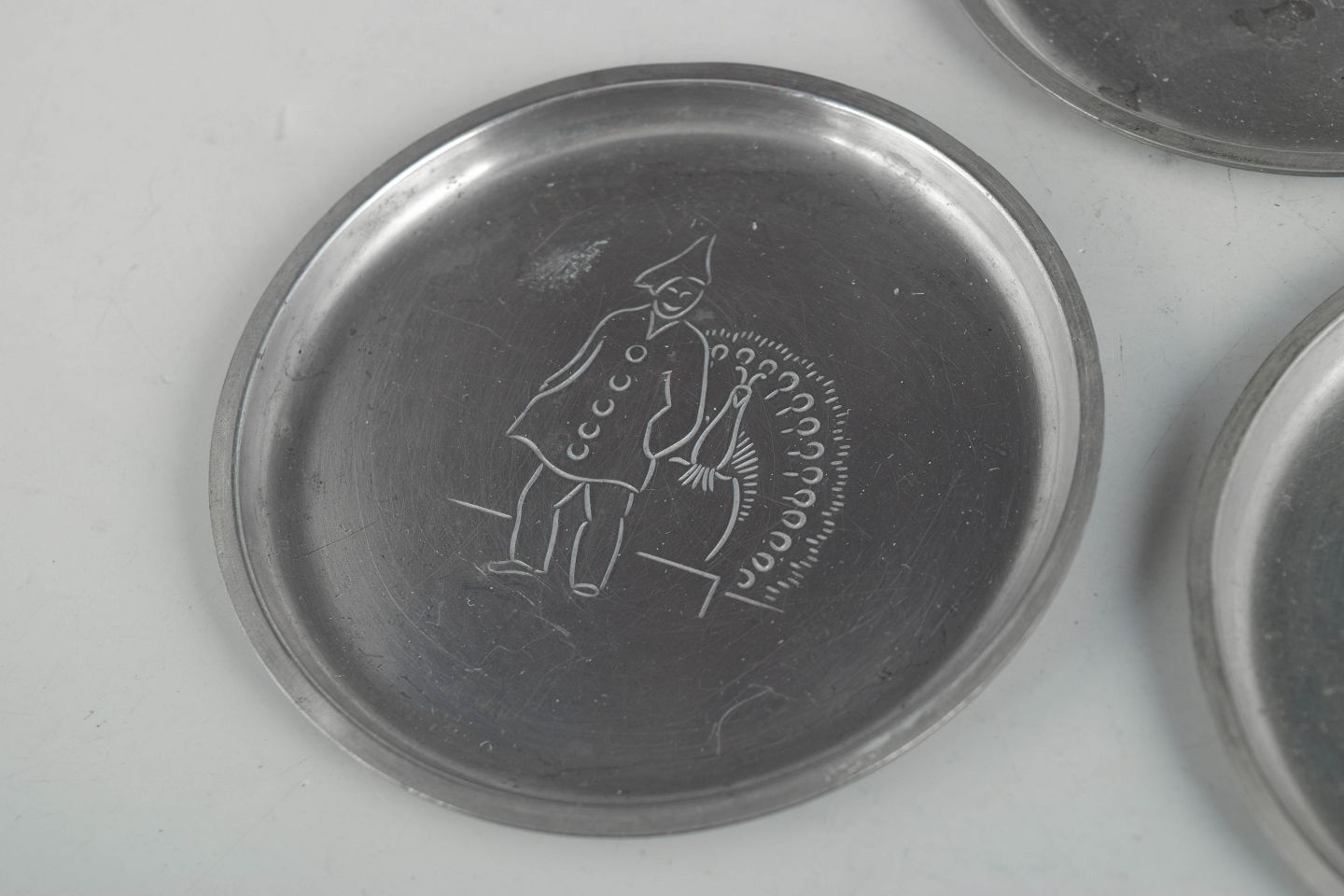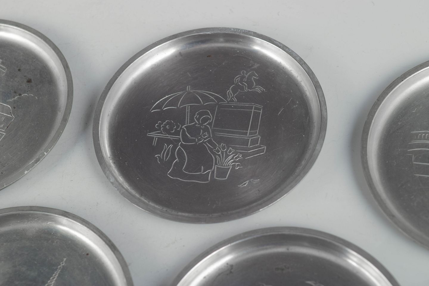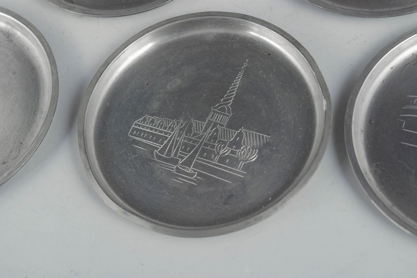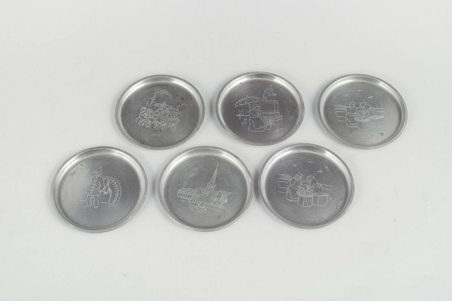 Just Andersen, sæt af seks glasbakker i tin med københavnermotiver.Beschreibung: