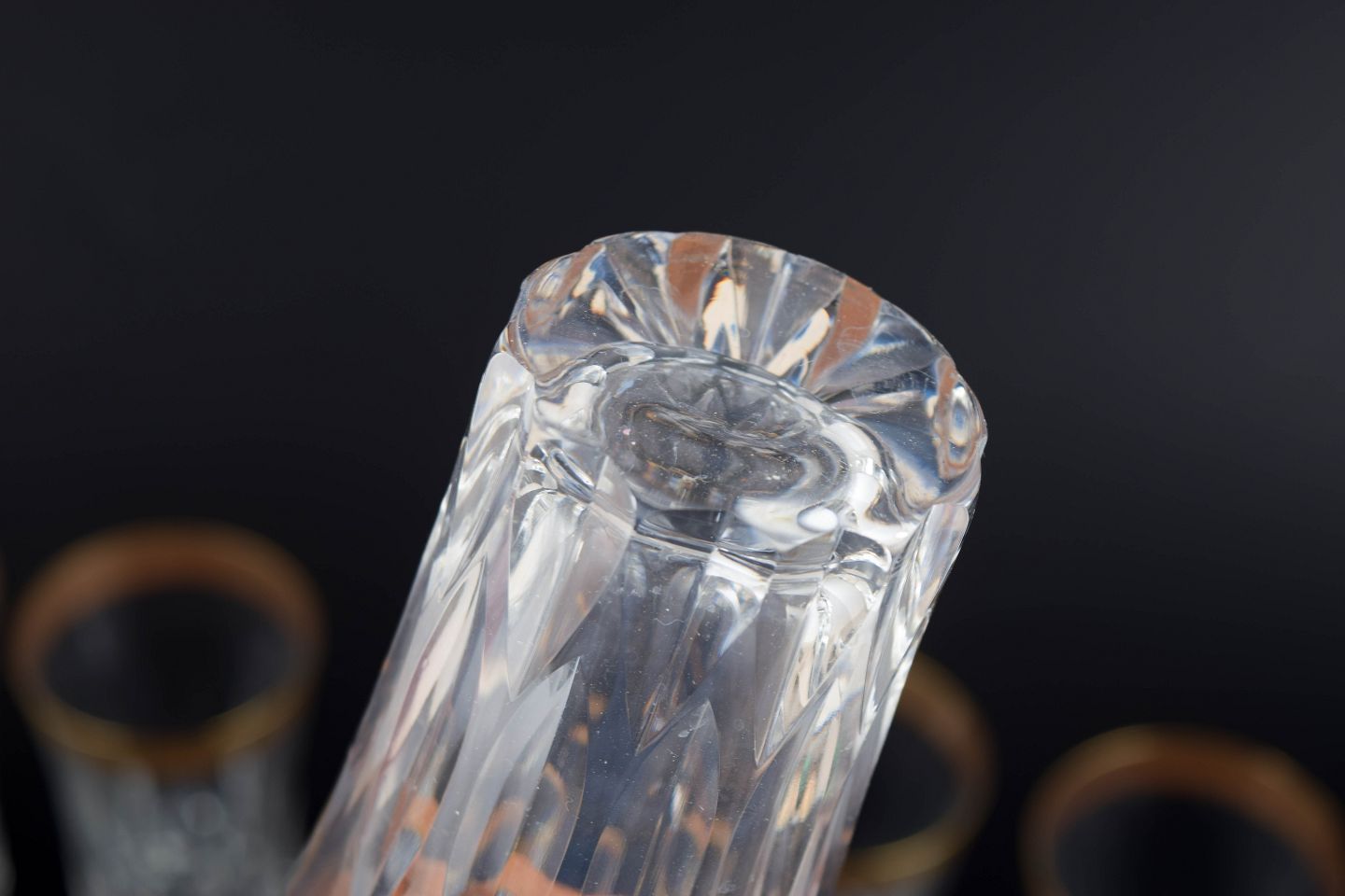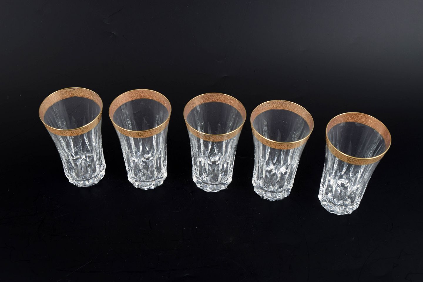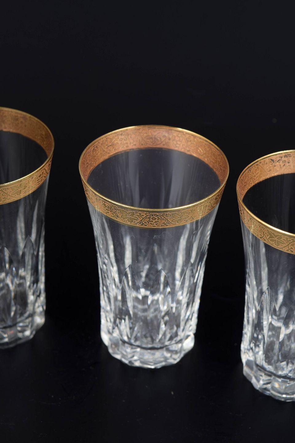 Elegante drikkeglas i facetslebet krystal med dekoration i 24 karat guld langs kanten, udført i klassisk midten af det 20. århundrede stil.