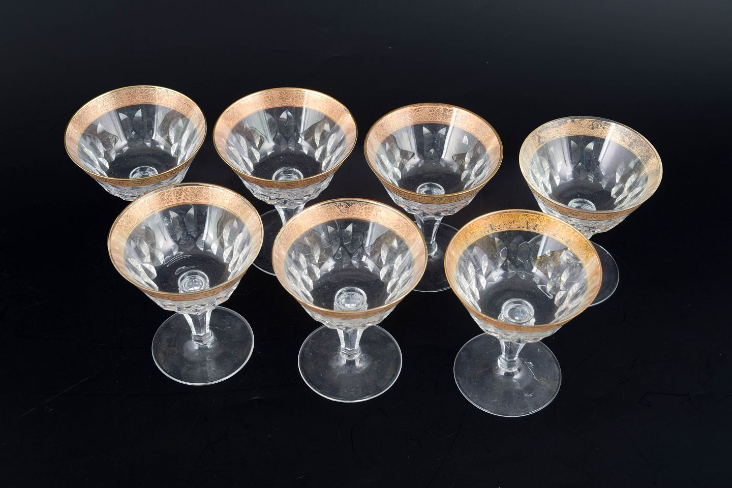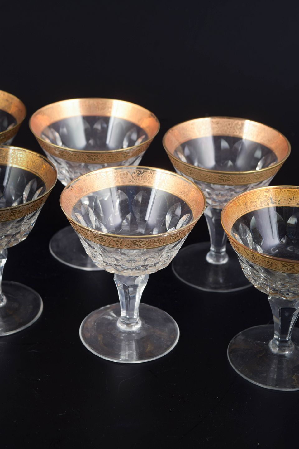 Artemisia, sæt af syv likørglas.Elegante likørglas i facetslebet krystal med dekoration i 24 karat guld langs kanten, udført i klassisk midten af det 20. århundrede stil.