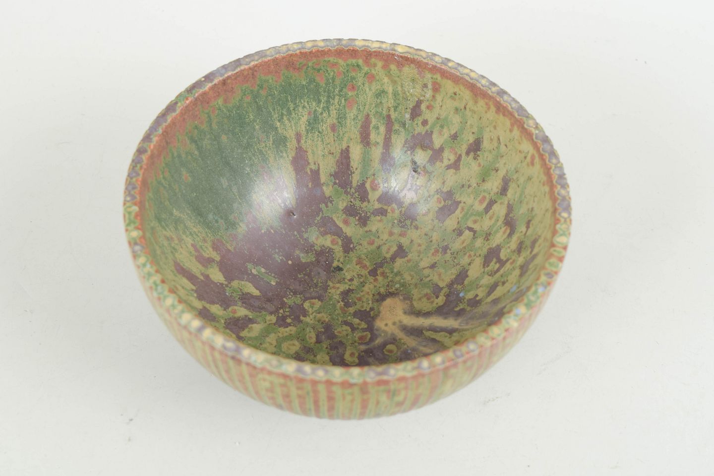 Rund skål i stentøj med riflet korpus og levende glasur i grønne og rosa nuancer. Model 111.