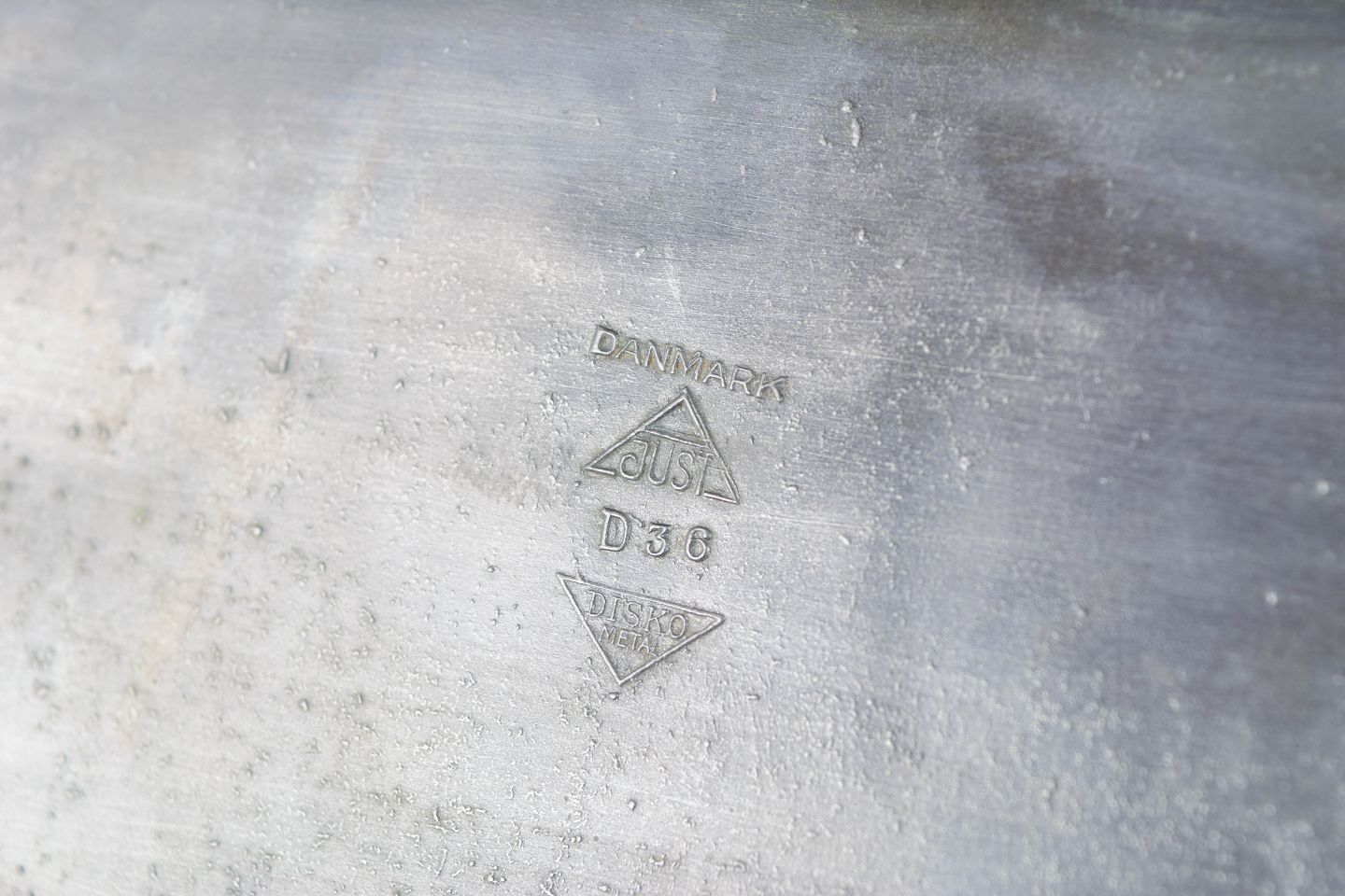 Blækhus i tin med rektangulær bakke, cylindrisk beholder med riflet dekoration og låg samt original glasindsats. Model D36.