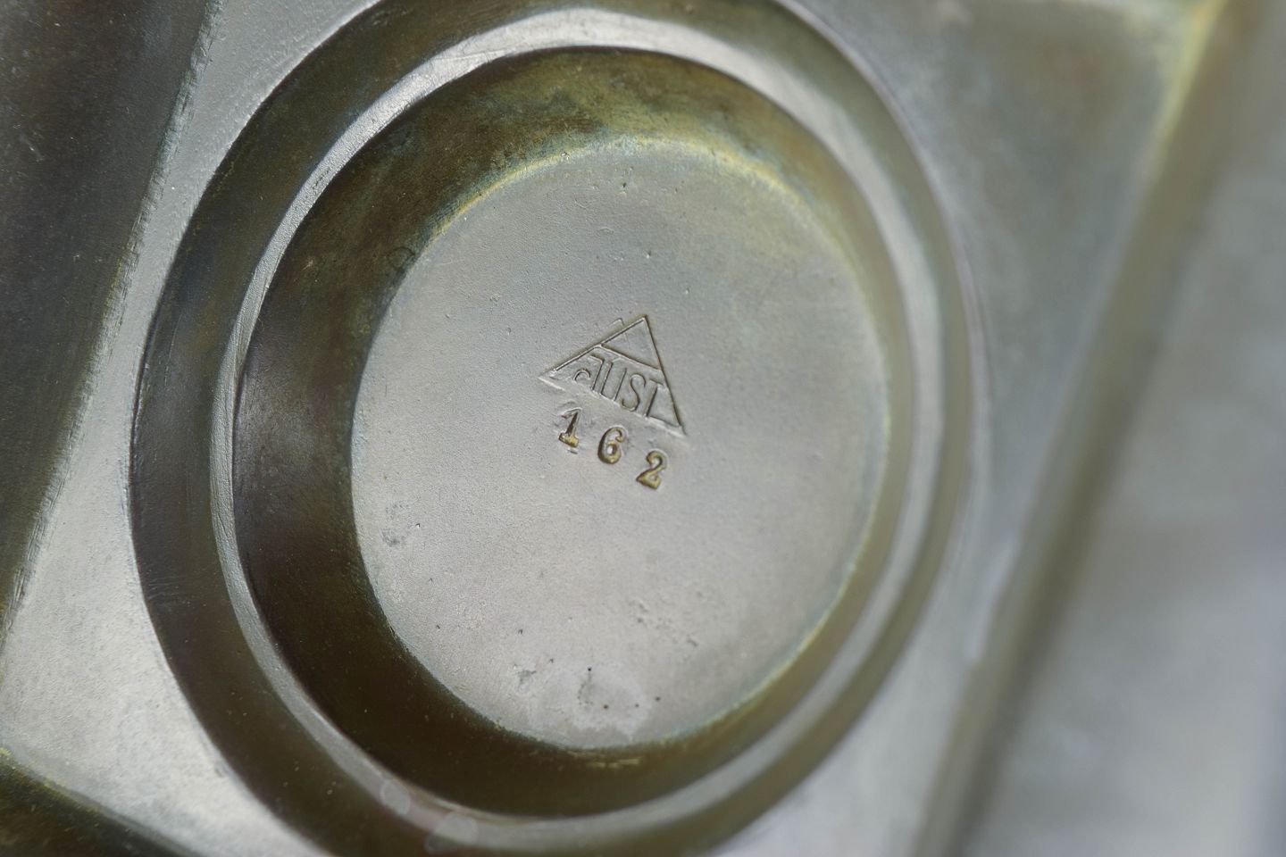 Blækhus i diskometal med kvadratisk bakke og original glasindsats, toppet med riflet låg i klassisk art deco formsprog.