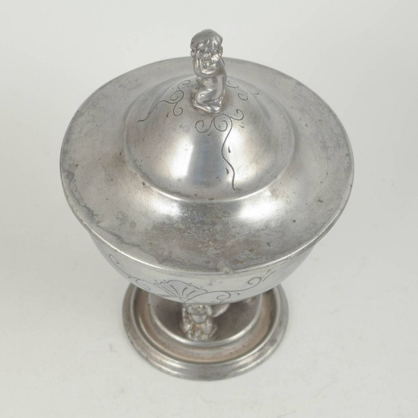 HAGS Tenn, opsats med låg i tin.Dekorativ opsats i tin med låg og figurformet knop, udført med indgraveret dekoration og stående på tre små fødder.