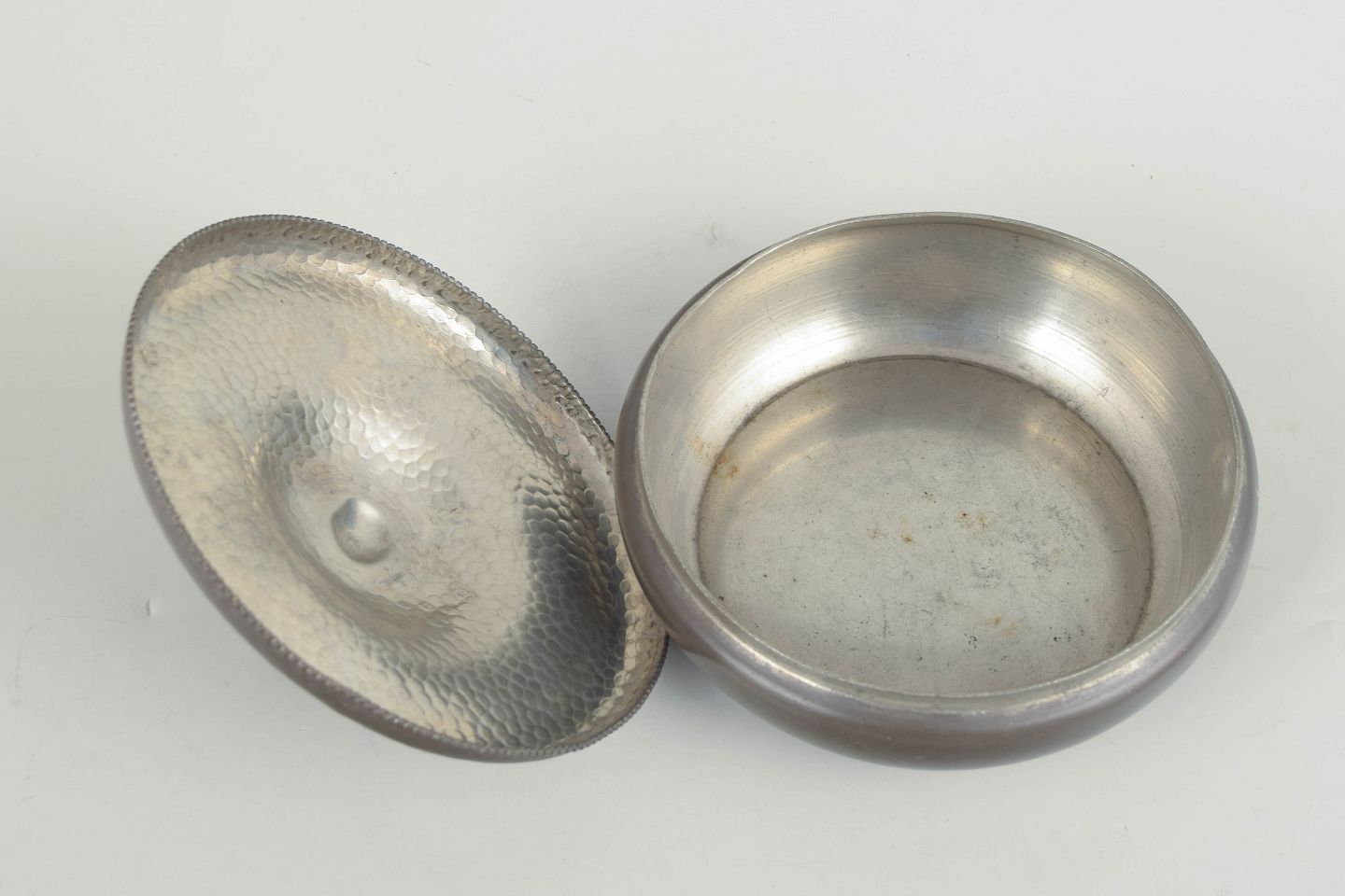 Chr. R. Kunst tin, lågskål med figur.Art deco lågskål i tin med rund, blød form og låg afsluttet med dekorativ figur som knop.